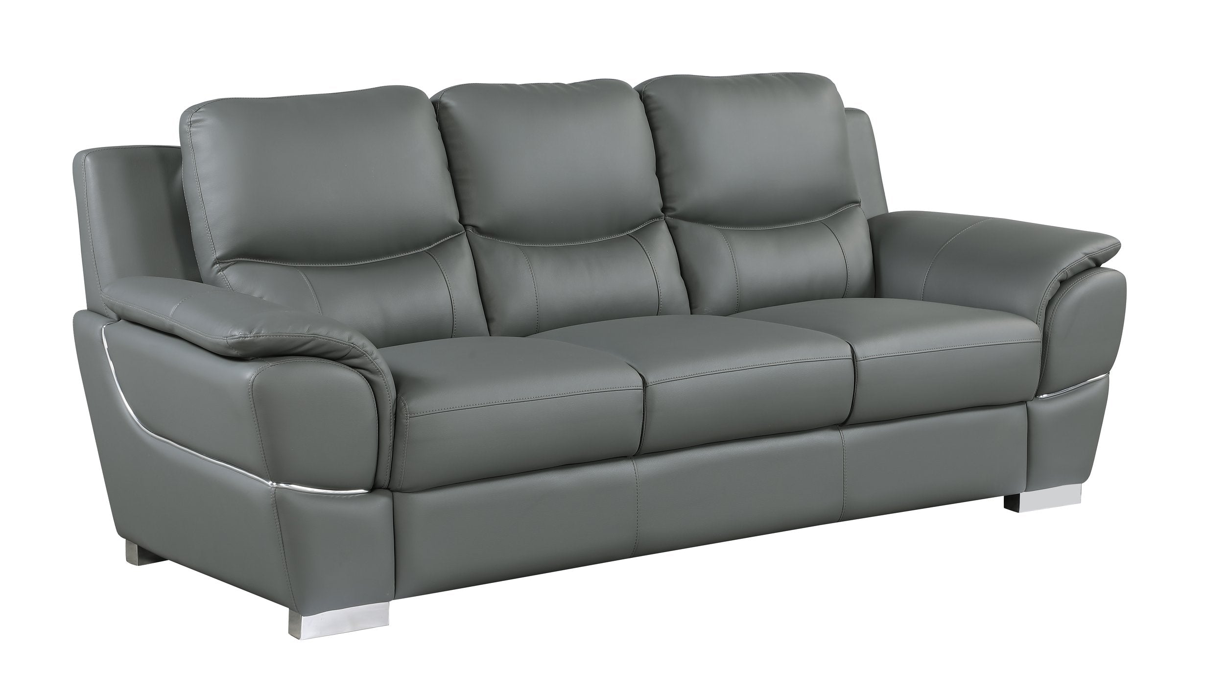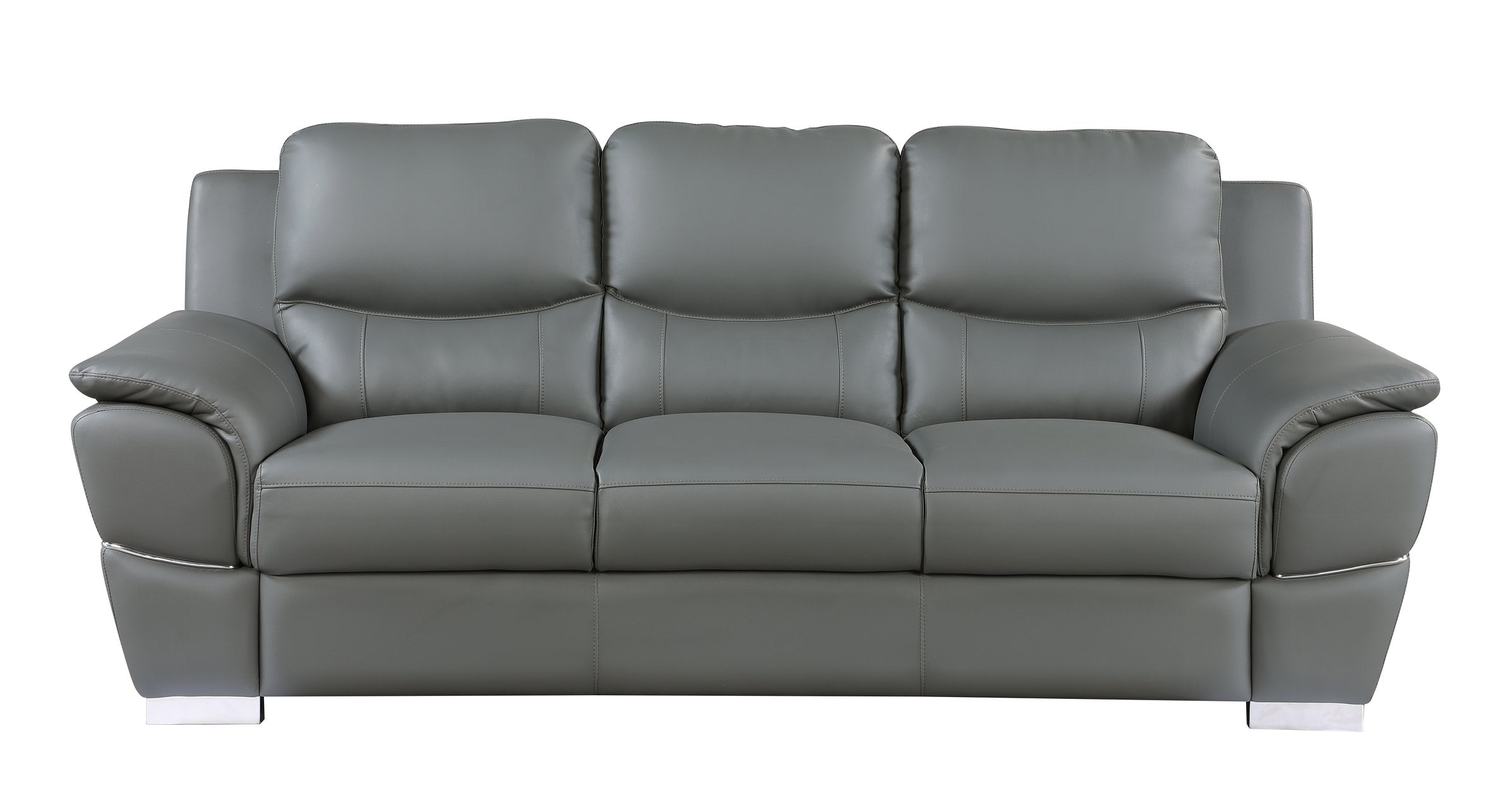 Elevate your living space with this Global United genuine leather sofa—an elegant blend of premium materials, modern design, and lasting comfort. Upholstered in smooth gray genuine leather and supported by a solid Brazilian wood frame, this sofa delivers refined style and everyday durability, while high-density cushioning and chrome-finish stainless steel legs ensure both comfort and contemporary appeal.