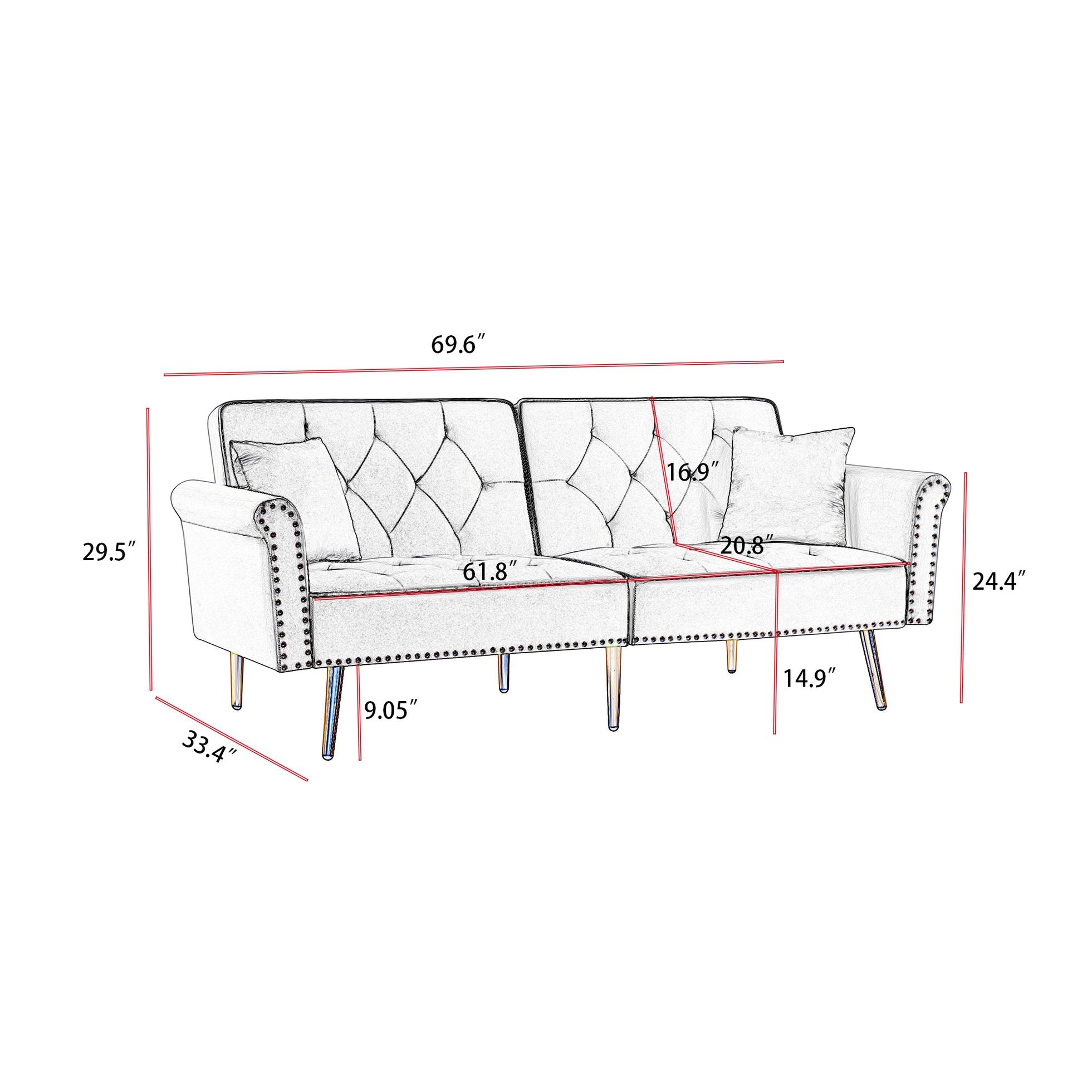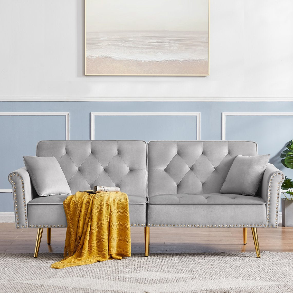 Elevate your living space with this elegant grey velvet tufted sofa couch — a stylish, comfortable centerpiece that blends classic tufting and nailhead trim with modern gold metal legs. Designed for both looks and practicality, it includes two matching pillows and a sturdy mixed-wood frame for everyday use and comfort.
