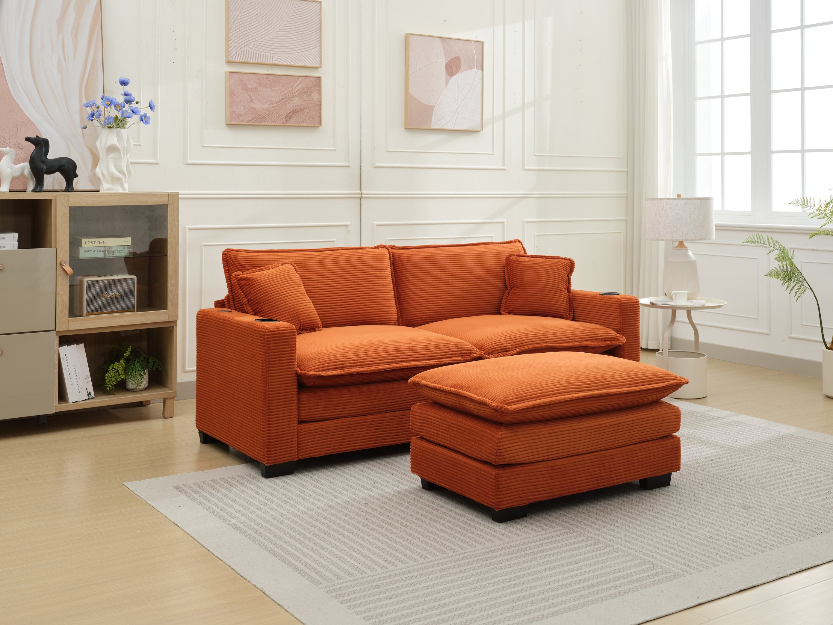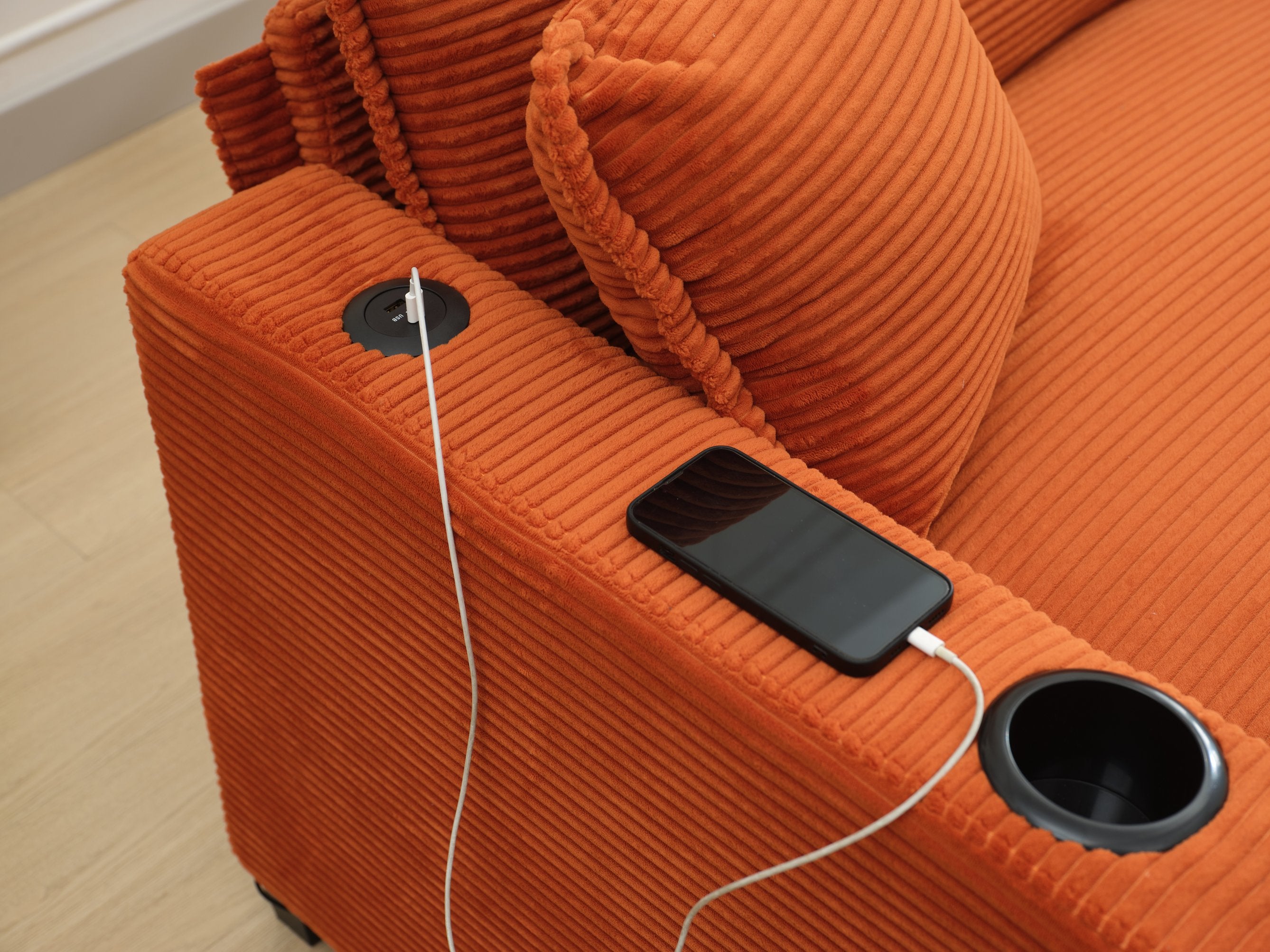Sink into modern comfort with this stylish L-shaped 2-seater sofa and matching footstool, designed for everyday living in apartments, offices, and cozy living rooms. Upholstered in soft, skin-friendly corduroy with a striped texture and finished in vibrant orange, this modular sectional combines practical features—like a built-in USB port and cup holder—with resilient cushioning for extended relaxation and easy, one-person assembly.