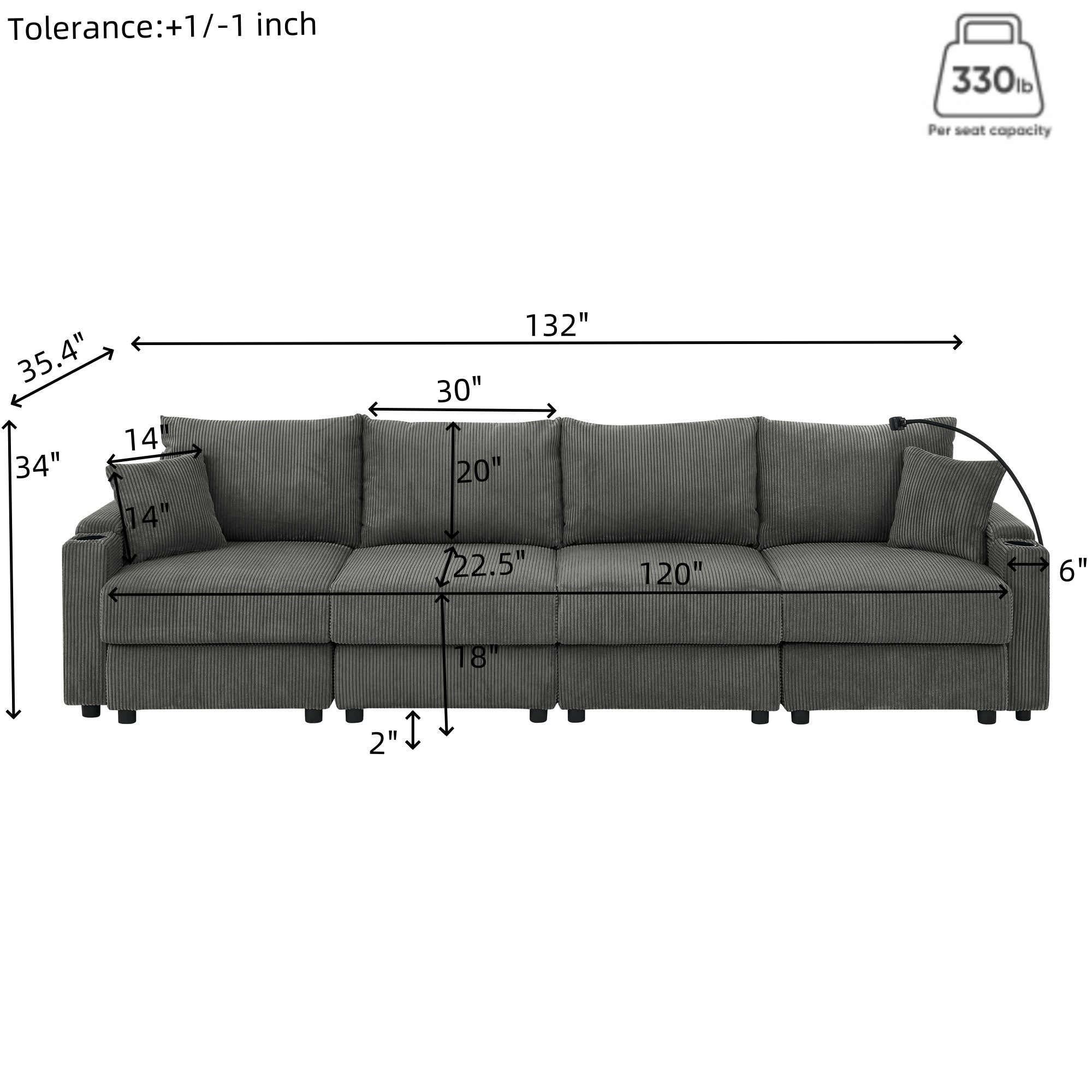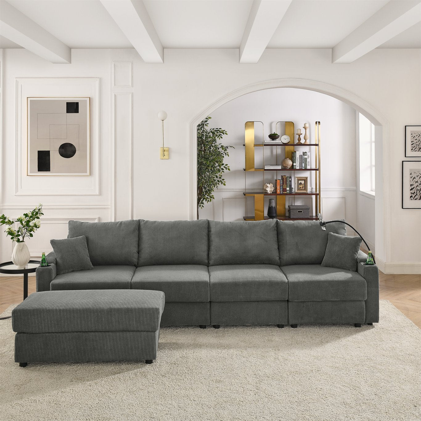 Sink into modern comfort with this L-shaped 4-seat corduroy sofa—designed for everyday lounging, entertaining, and smart storage. Plush deep seats, generous armrests, built-in cup and phone holders, and a matching ottoman combine polished style with practical features to elevate your living room. Durable construction and soft, breathable corduroy make this a cozy centerpiece that’s easy to care for and built to last.