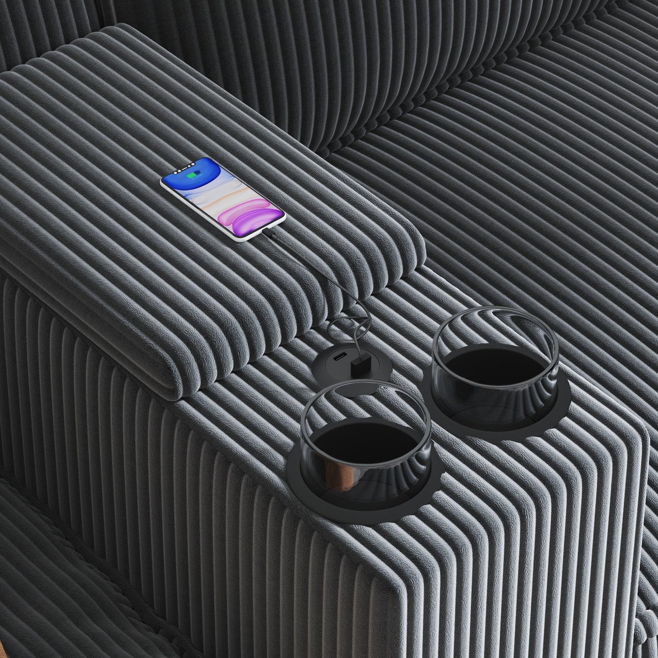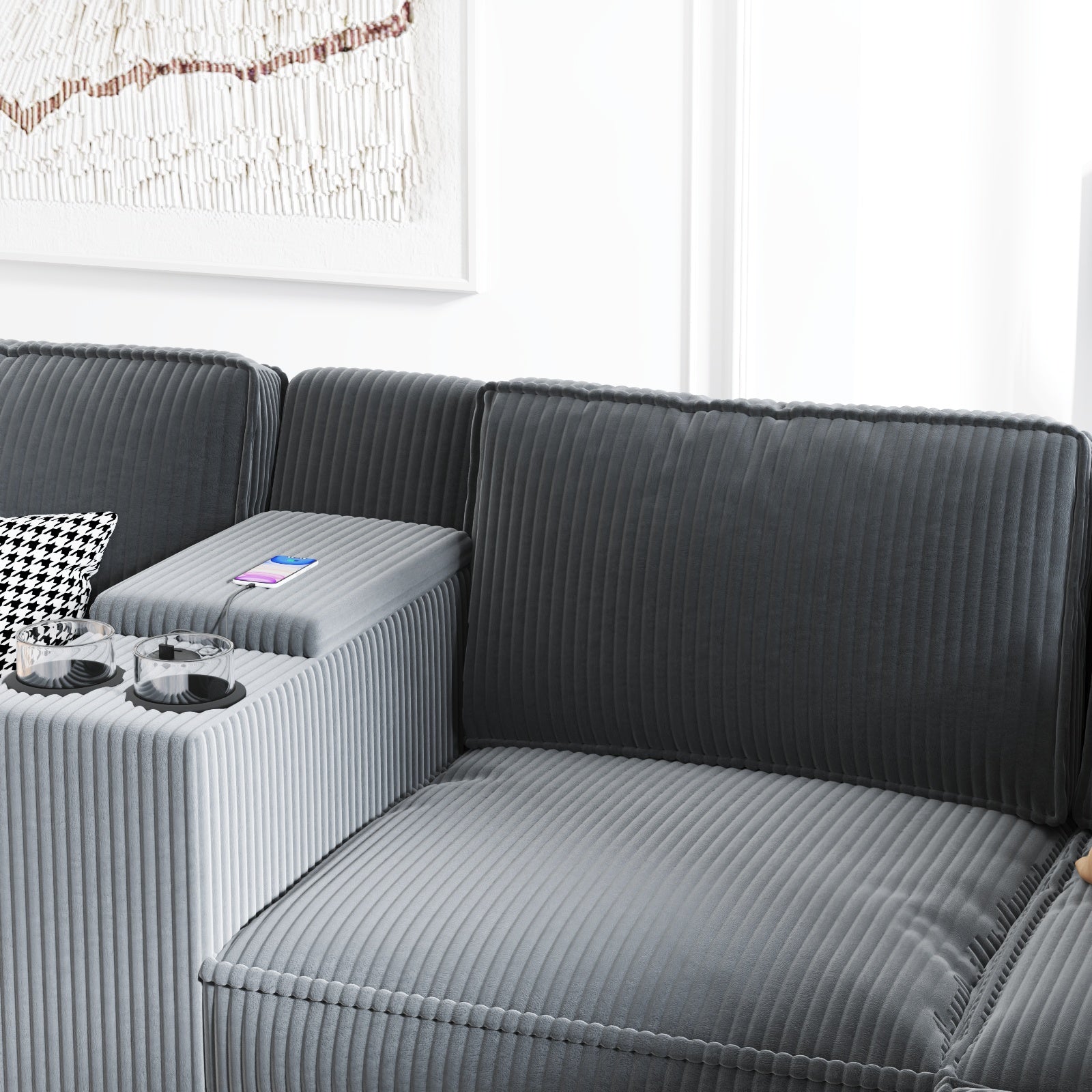 Sink into casual comfort with this versatile L-shaped 4-seater corduroy sofa designed for modern living rooms. Generously sized and thoughtfully appointed, it combines deep seating, ample storage, and convenient tech features—plus a configurable layout—so you can create the perfect lounge setup for family, friends, or everyday relaxation.