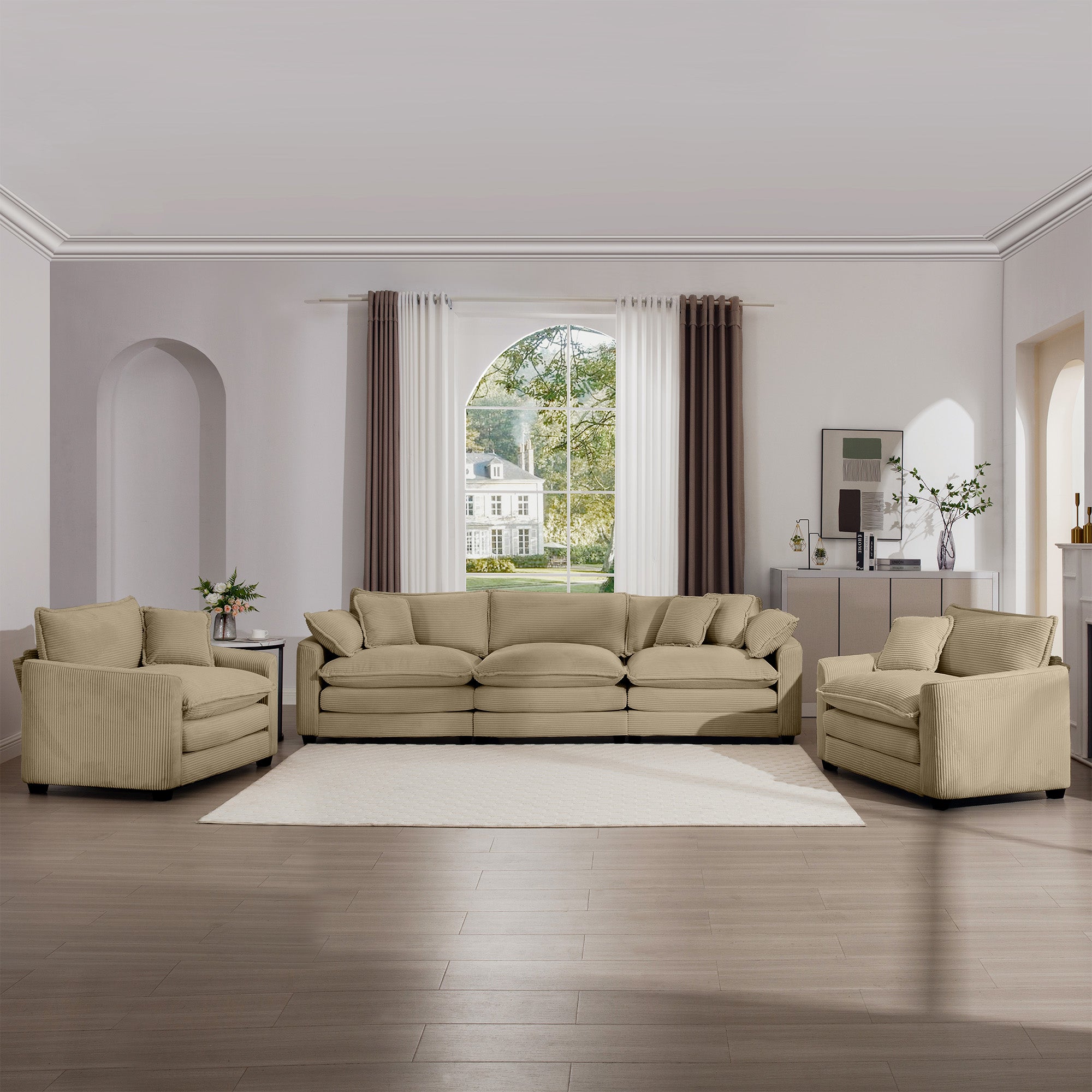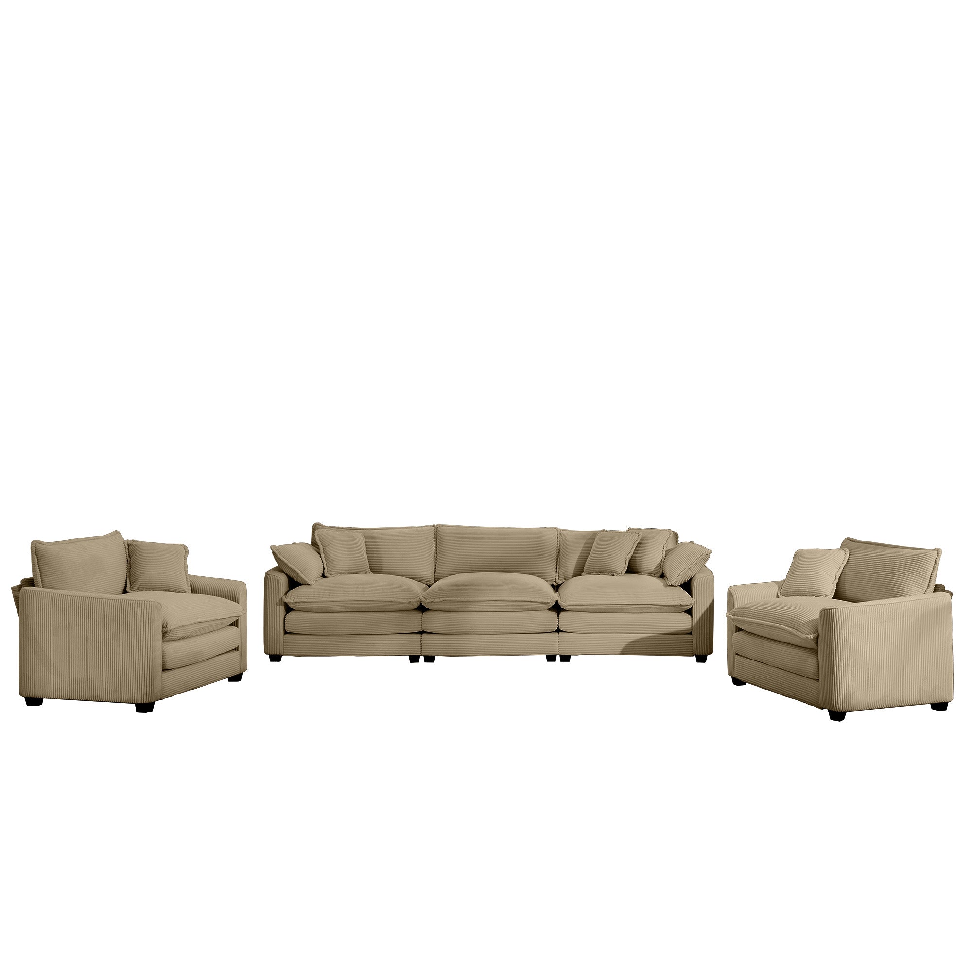 Transform your living space with this luxurious tan corduroy sofa set that combines retro charm with contemporary elegance. Designed for comfort and style, the set includes two single sofas and a three-seater to create versatile seating arrangements for living rooms, home theaters, clubs, or guestrooms. Plush corduroy upholstery, resilient memory foam cushions, and removable armrests ensure lasting comfort, while clean lines and a soft sheen add a refined, timeless look.