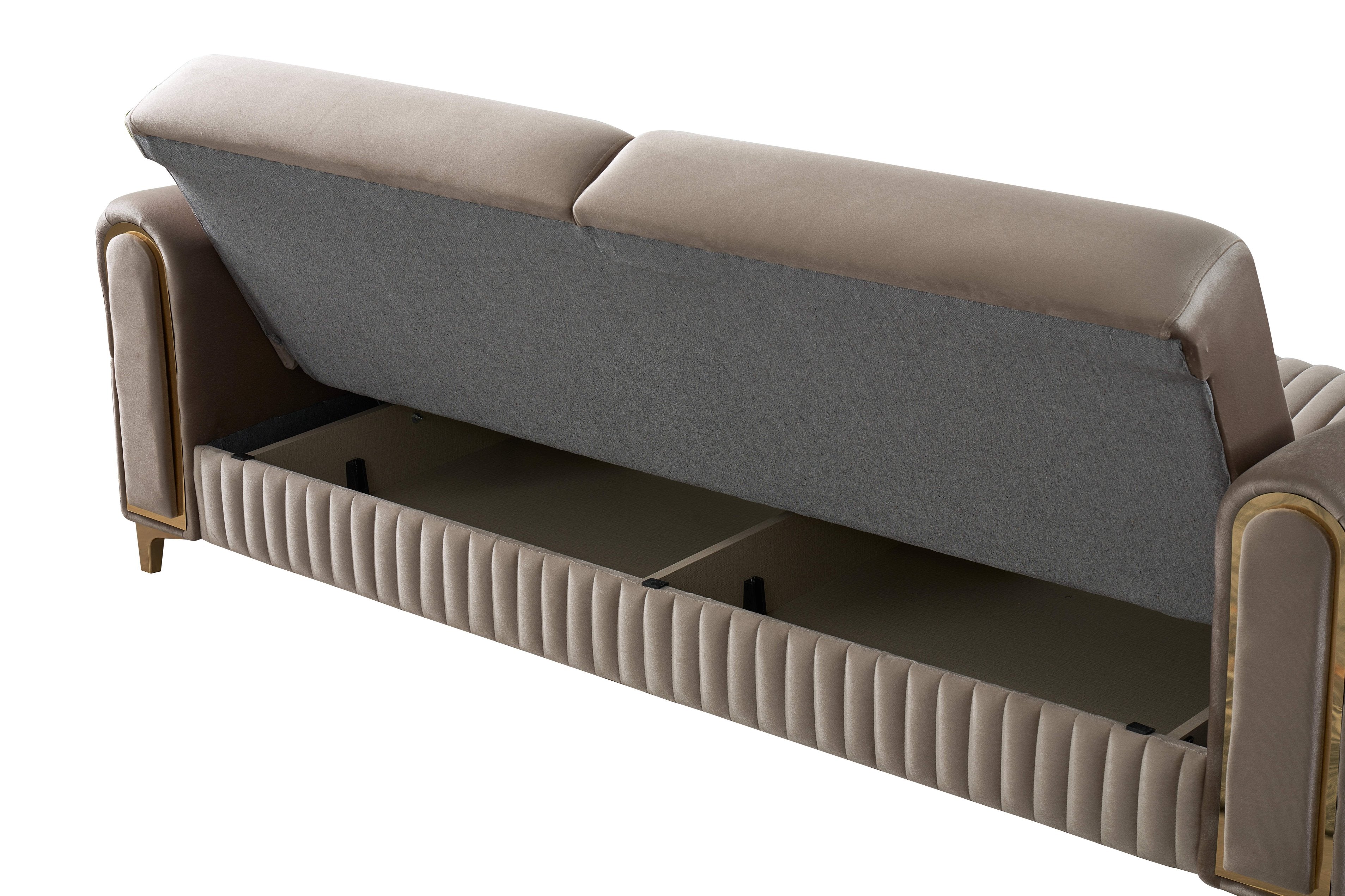 Add a touch of modern luxury to your living room with this velvet-upholstered convertible sleeper sofa. Designed to balance contemporary style with practical functionality, it features refined vertical channel tufting, polished gold-tone metal accents, and a sturdy wood-and-iron frame. Ideal for everyday seating or overnight guests, the sofa delivers comfort, durability, and a sophisticated silhouette that complements both modern and transitional interiors.