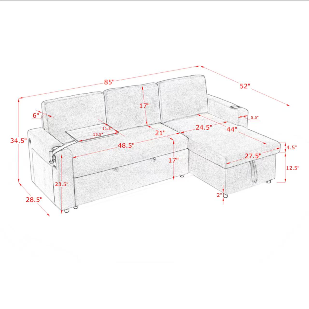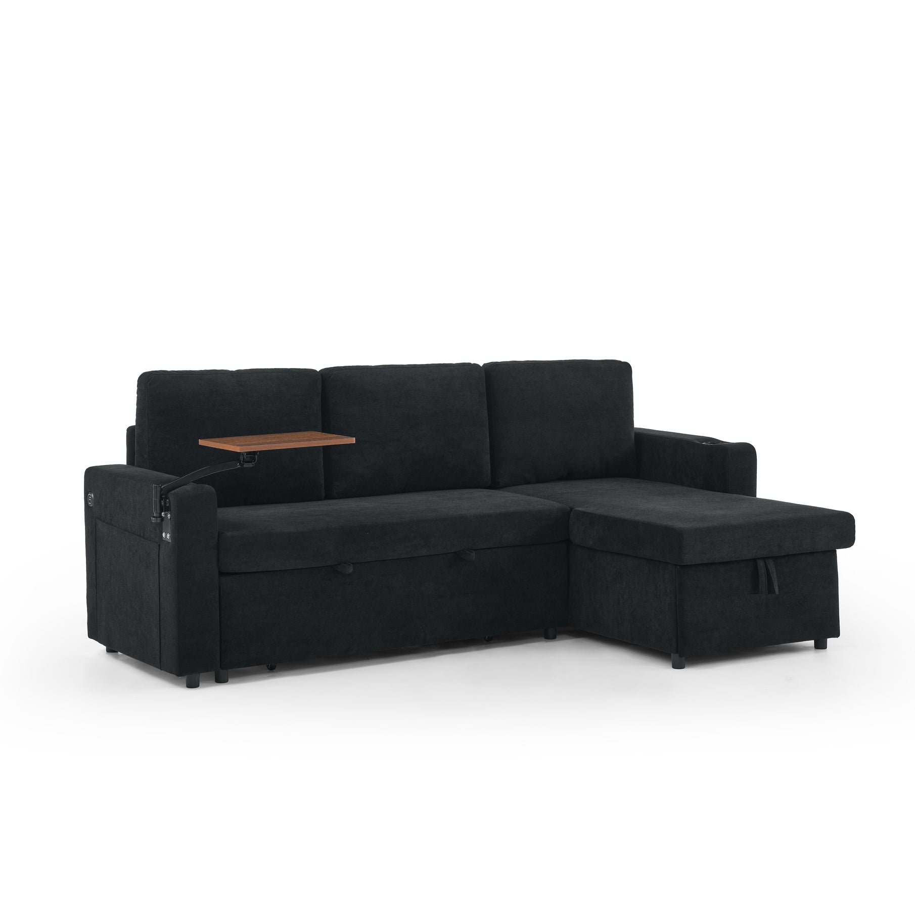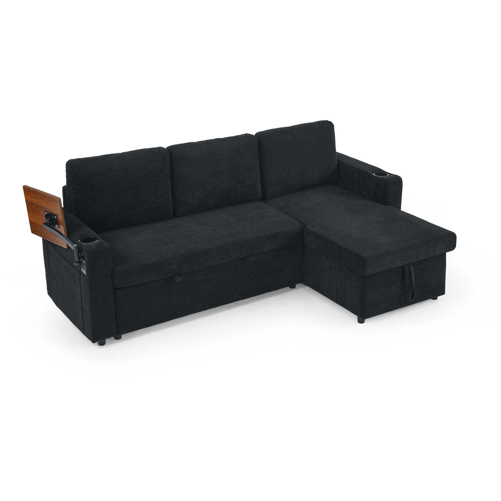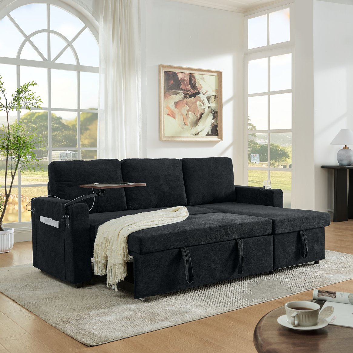 Upgrade your living space with this modern chenille sofa that converts effortlessly into a pull-out bed. Thoughtfully designed for everyday comfort and convenience, it features integrated LED lighting, USB charging ports, cup holders, and a retractable table—making it perfect for lounging, working, or hosting overnight guests. Durable construction and plush foam cushions provide lasting support, while the sleek black chenille upholstery complements contemporary interiors.