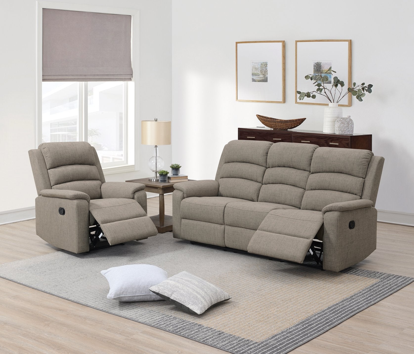 Unwind in style with this modern 3-seater manual motion recliner, upholstered in durable burlap fabric for a relaxed yet refined look. Thoughtfully padded headrests and armrests provide plush support for movie nights, reading, or casual lounging, while the neutral light brown finish integrates easily with a variety of living room decor. This single-piece motion recliner is built for comfort and everyday use with a clean silhouette and simple assembly.
