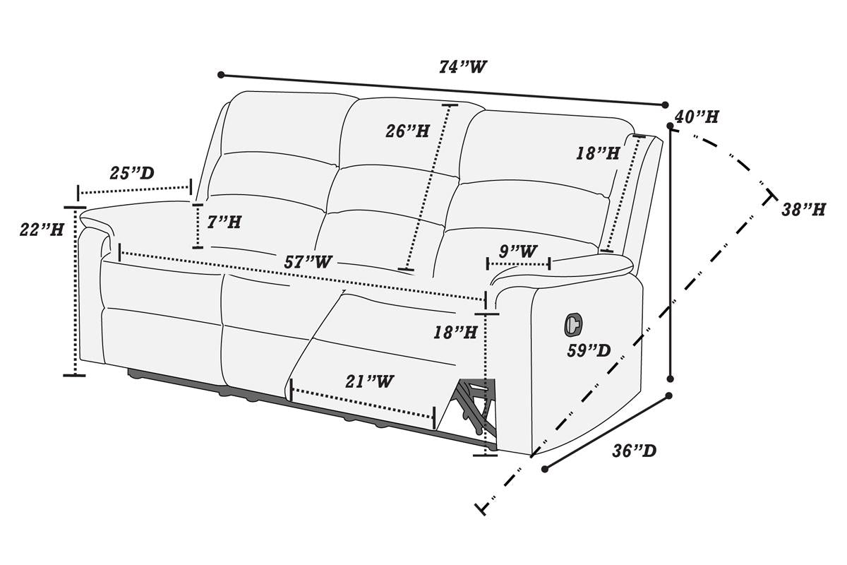 - Product dimensions: Recliner Sofa — 74"W x 36"L x 40"H (prominent dimension listing)