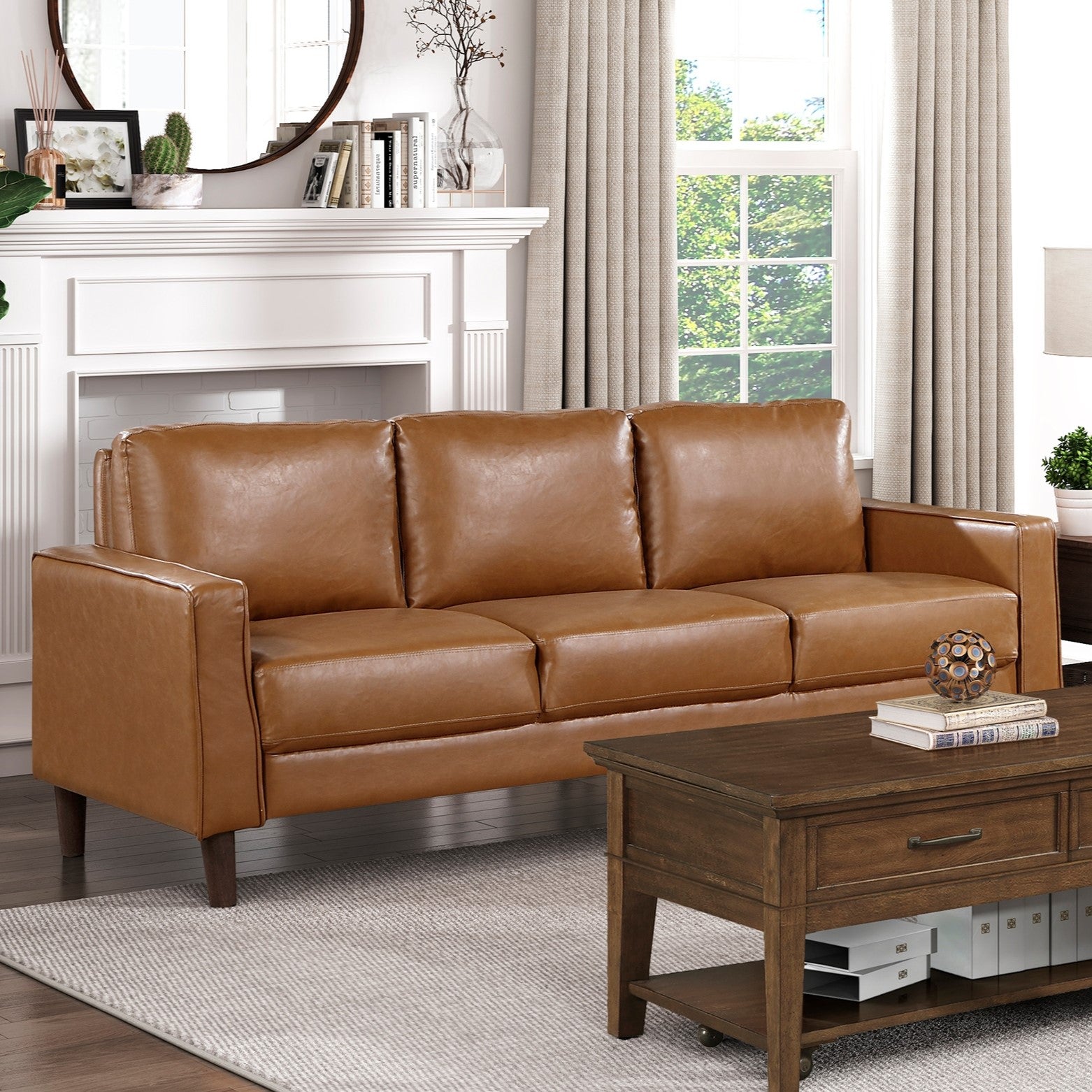 Bring modern sophistication and everyday comfort to your living space with this 3-seater sofa from the Malcolm Collection. Upholstered in rich brown faux leather and detailed with track arms and welt trim, this sofa pairs tailored styling with practical durability. Its clean lines suit modern, transitional, rustic, or industrial interiors, while a supportive cushion back and solid wood frame ensure long-lasting comfort for family and guests.