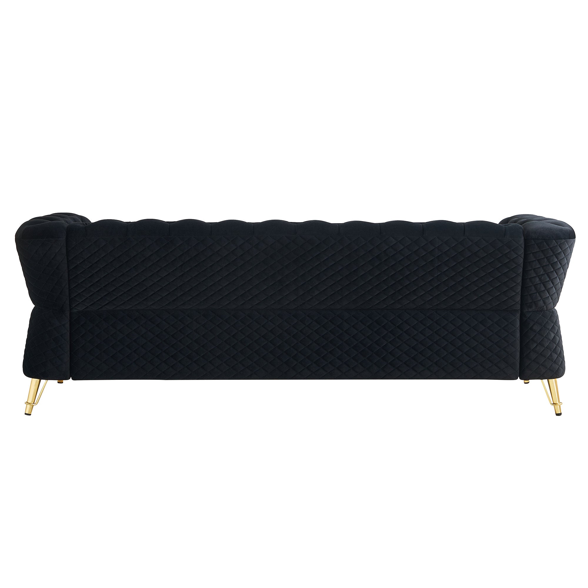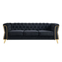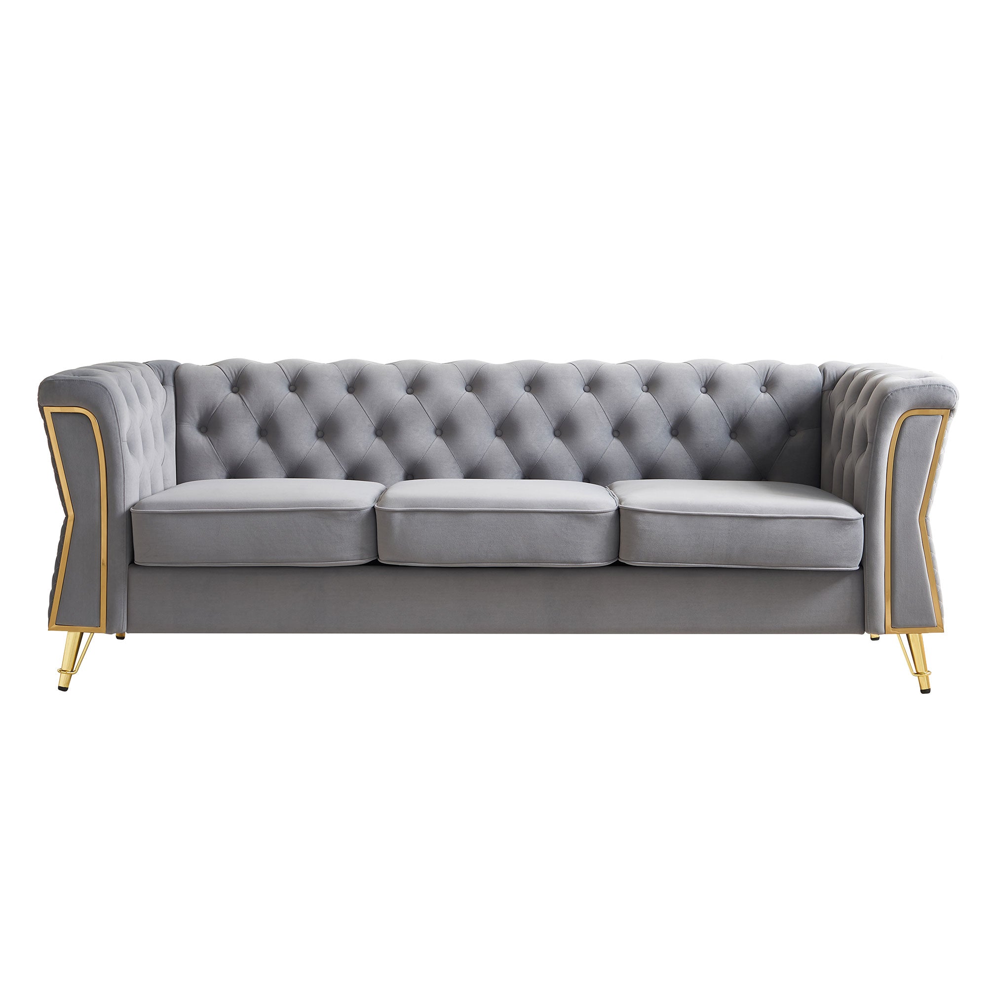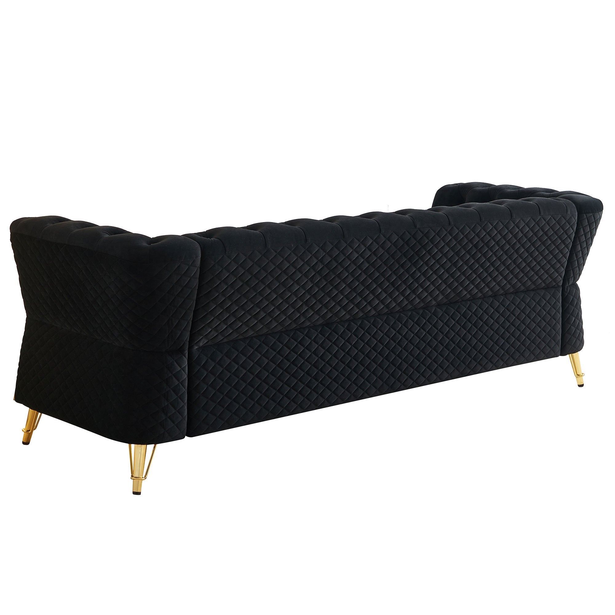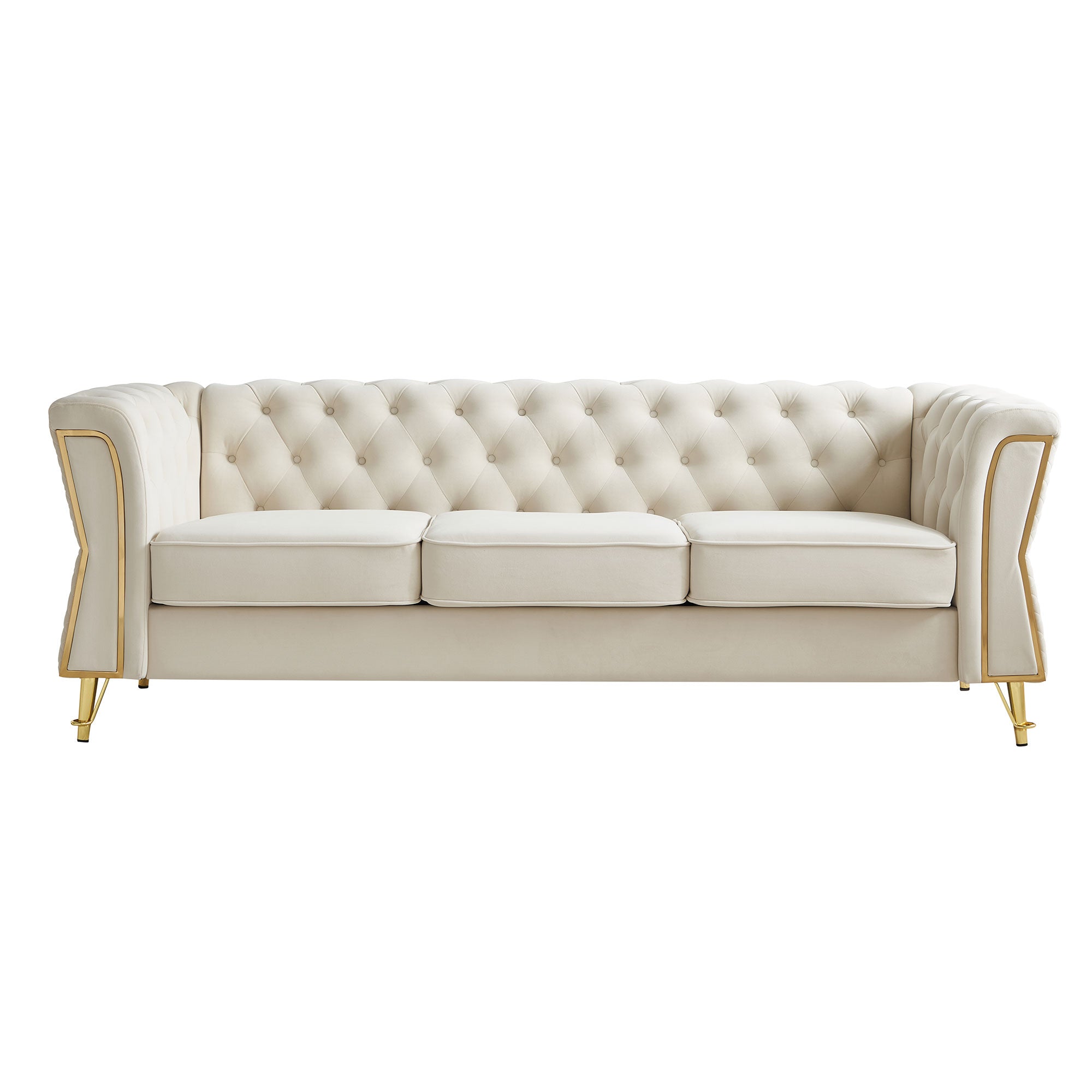 This modern tufted velvet sofa brings mid-century elegance and contemporary flair to your living room. Crafted with luxe velvet upholstery, a button-tufted back, and distinctive flared arms with gold metal accents, it combines visual sophistication with everyday comfort—ideal for movie nights, casual conversation, or quiet relaxation.