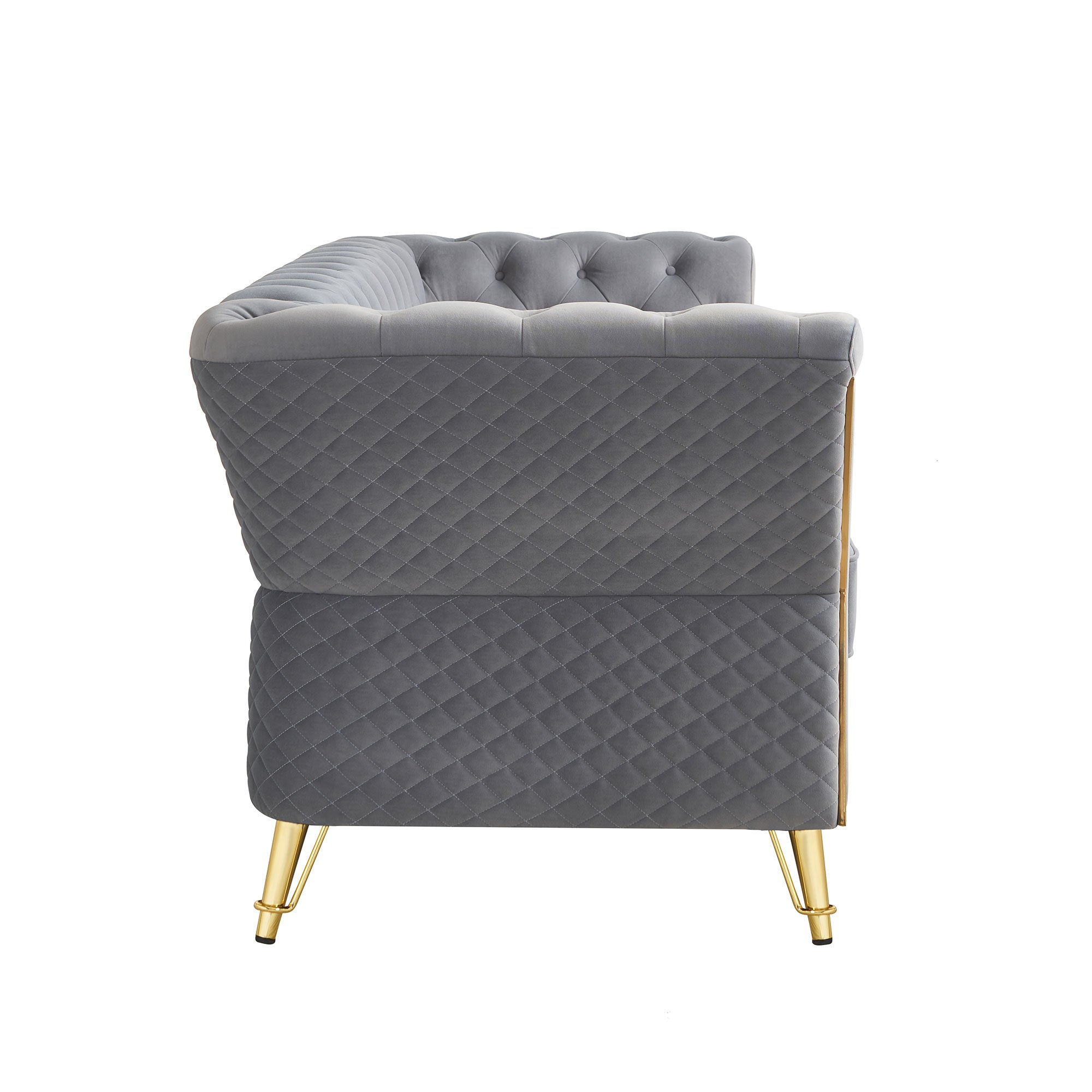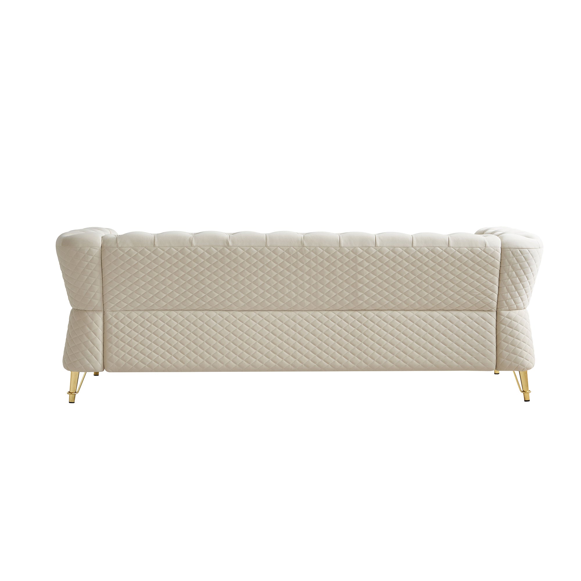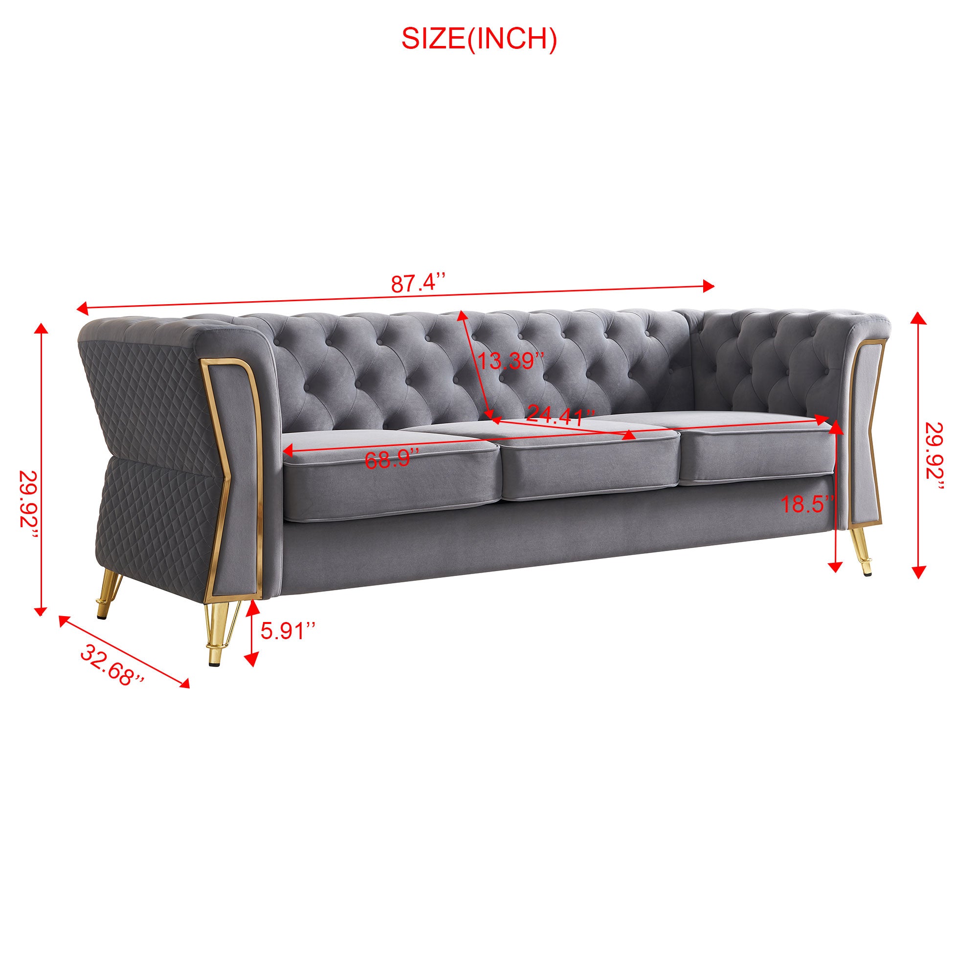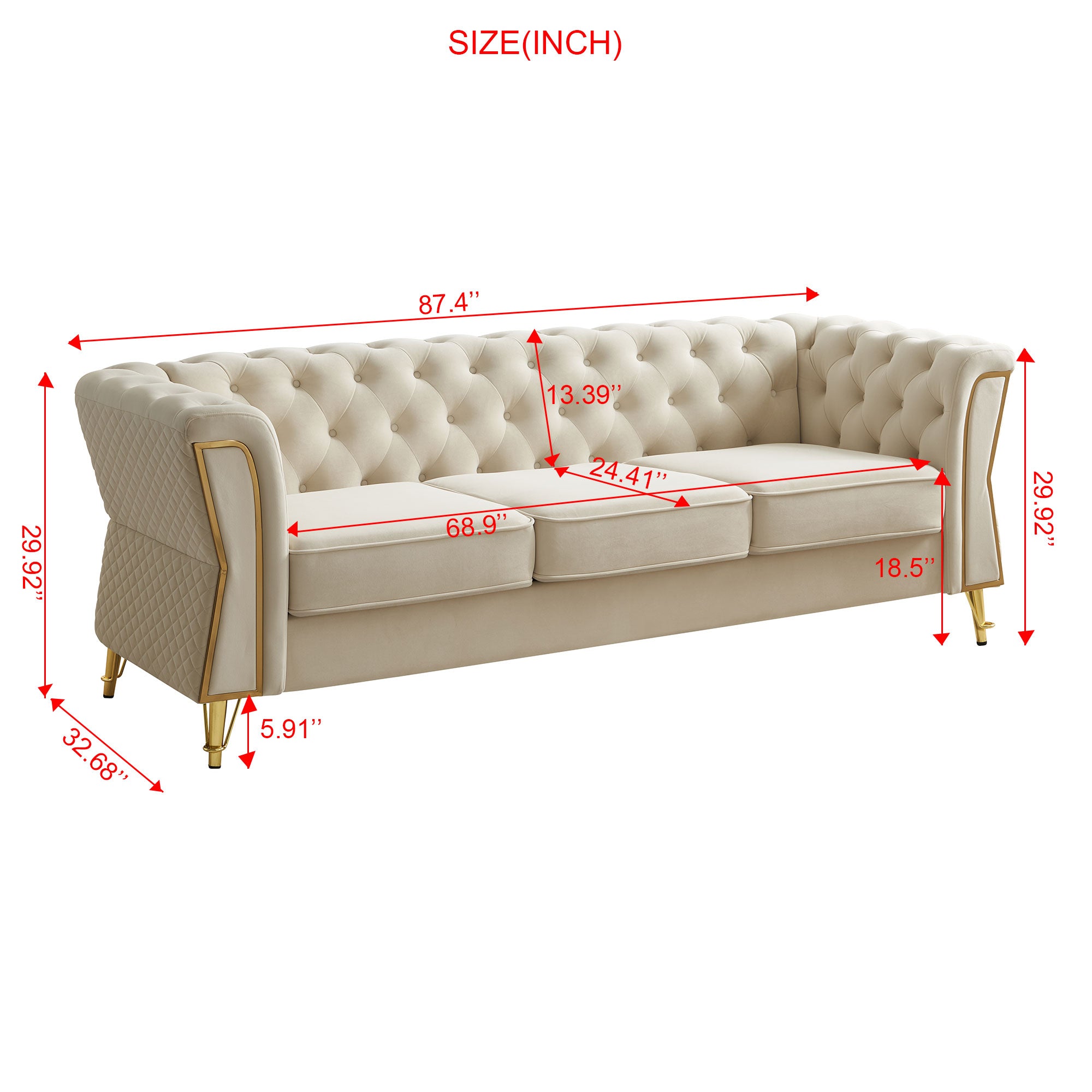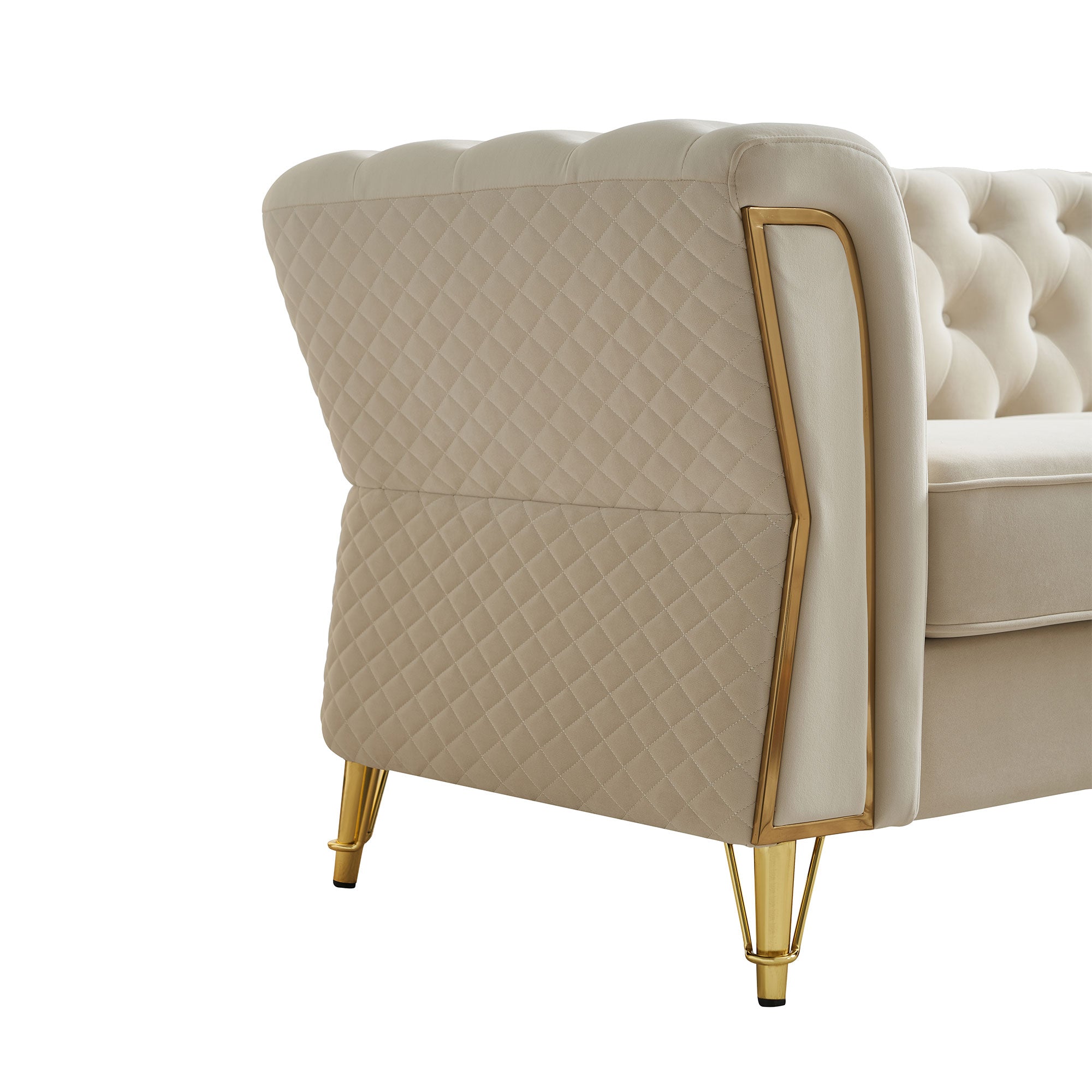 This modern tufted velvet sofa brings mid-century elegance and contemporary flair to your living room. Crafted with luxe velvet upholstery, a button-tufted back, and distinctive flared arms with gold metal accents, it combines visual sophistication with everyday comfort—ideal for movie nights, casual conversation, or quiet relaxation.