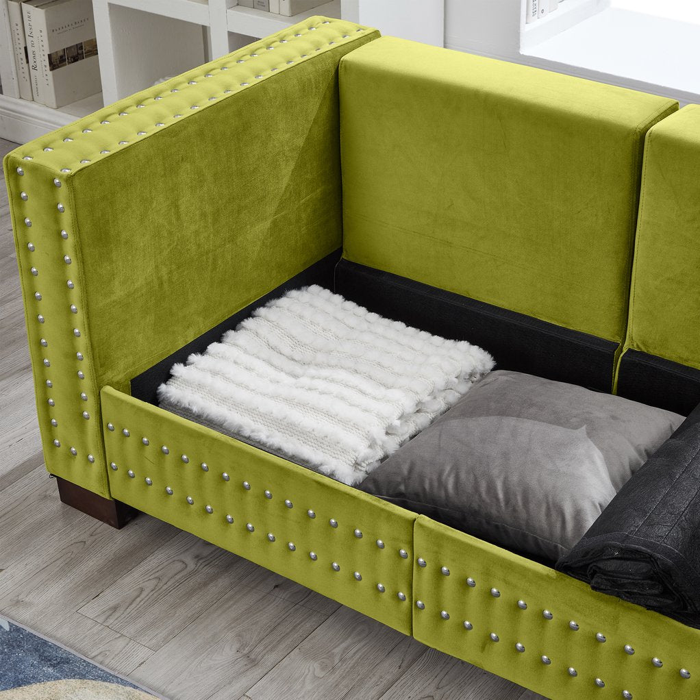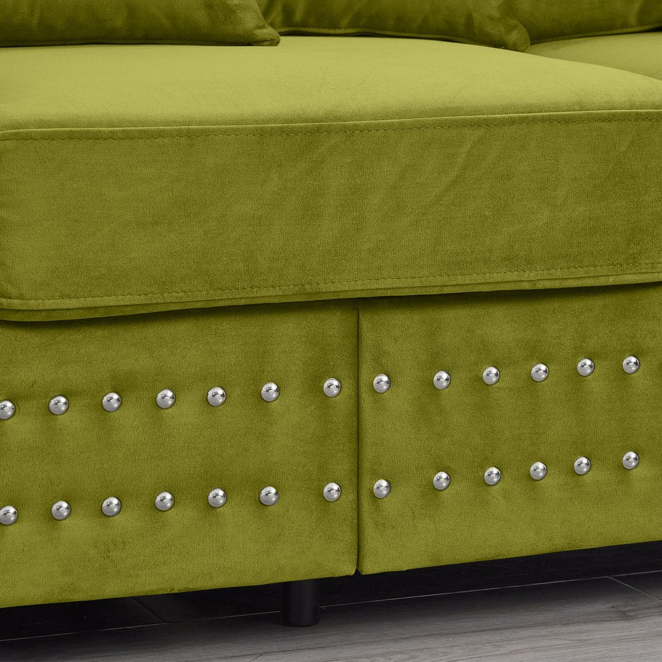 Elevate your living space with this modern velvet sofa that blends contemporary silhouette, tailored details, and durable construction. Designed for comfort and style, it features square armrests accented with silver nailhead trim, supportive pocketed coil seating, and a plush velvet upholstery that adds a luxurious touch to any room. Thoughtfully engineered with a solid wood and plywood frame and functional storage, this sofa delivers both form and function for everyday living.