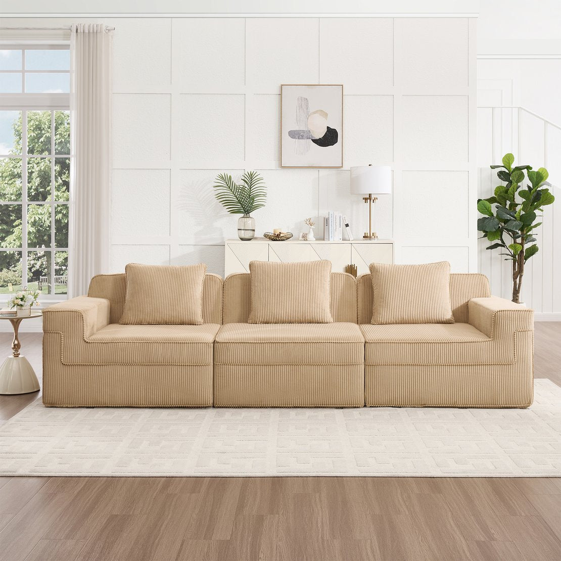 Experience cloud-like comfort with this modern modular 3-seat boneless sofa, thoughtfully designed for relaxed lounging and effortless styling. Upholstered in soft camel corduroy, it blends contemporary lines with a cozy, tactile finish—perfect for family rooms, media spaces, or cozy corners. Unbox, fluff, and enjoy a plush seating experience that settles into peak comfort within about 72 hours.