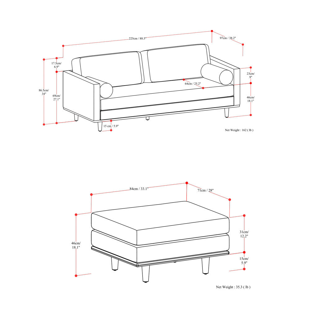 - 2-piece set for living room includes the mid-century modern style Morrison Sofa (39" D x 88.5" W x 34" H; supports up to 900 lbs) and matching ottoman (26" D x 33" W x 18” H; supports up to 300 lbs).