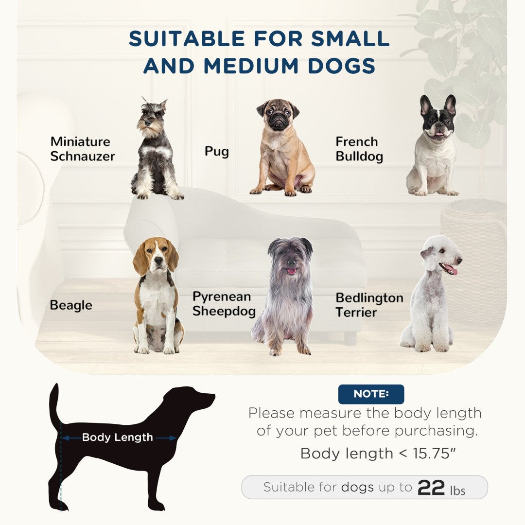 - Couch for Dogs Info: Overall Dimensions: 30" W x 17.75" D x 16.25" H. Storage Space: 25.25" W x 14.75" D x 3.75" H. Suitable for small and medium dogs up to 22 lbs. and 15.75" in body length.