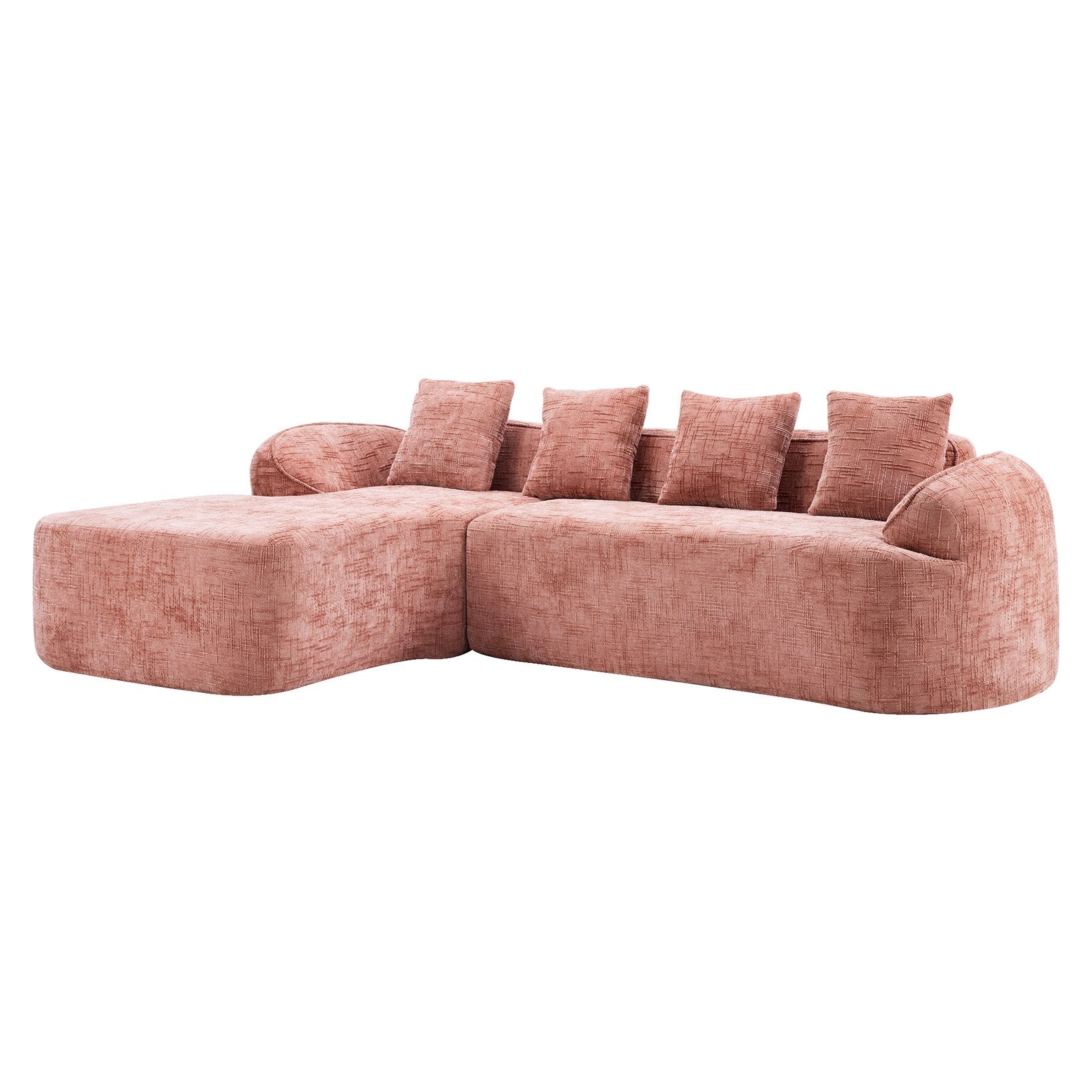 A stylish and comfortable pink chenille L-shaped sofa that brings a soft, modern touch to any living space. Upholstered in plush chenille, this compact sectional combines supportive high-elastic sponge and spring packs for lasting comfort and stability. Its space-saving L-shape and curved armrests create an inviting seating area ideal for living rooms, dens, or bedrooms, and it arrives factory-compressed for easier delivery and setup.