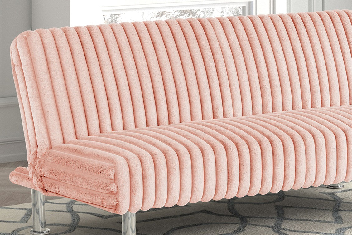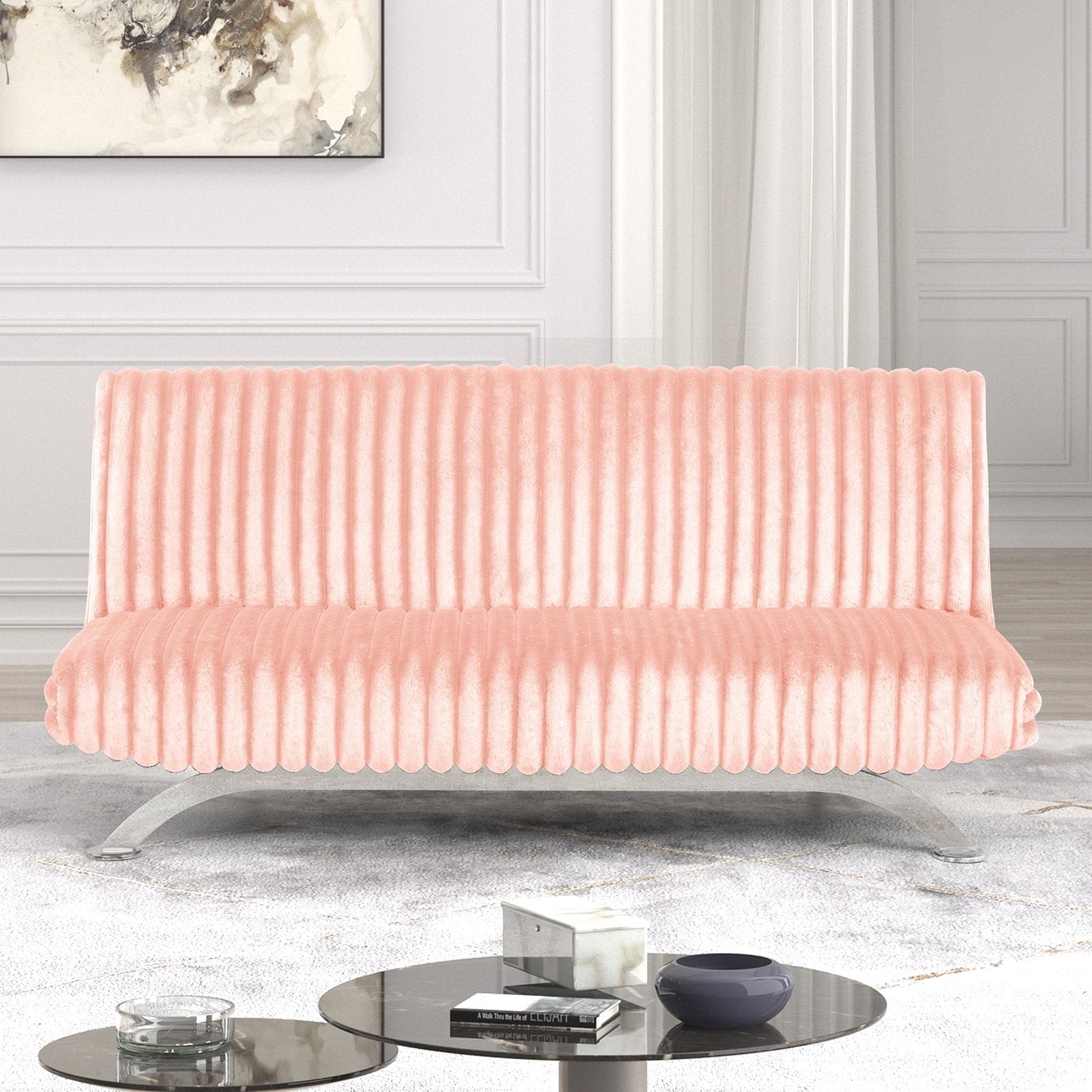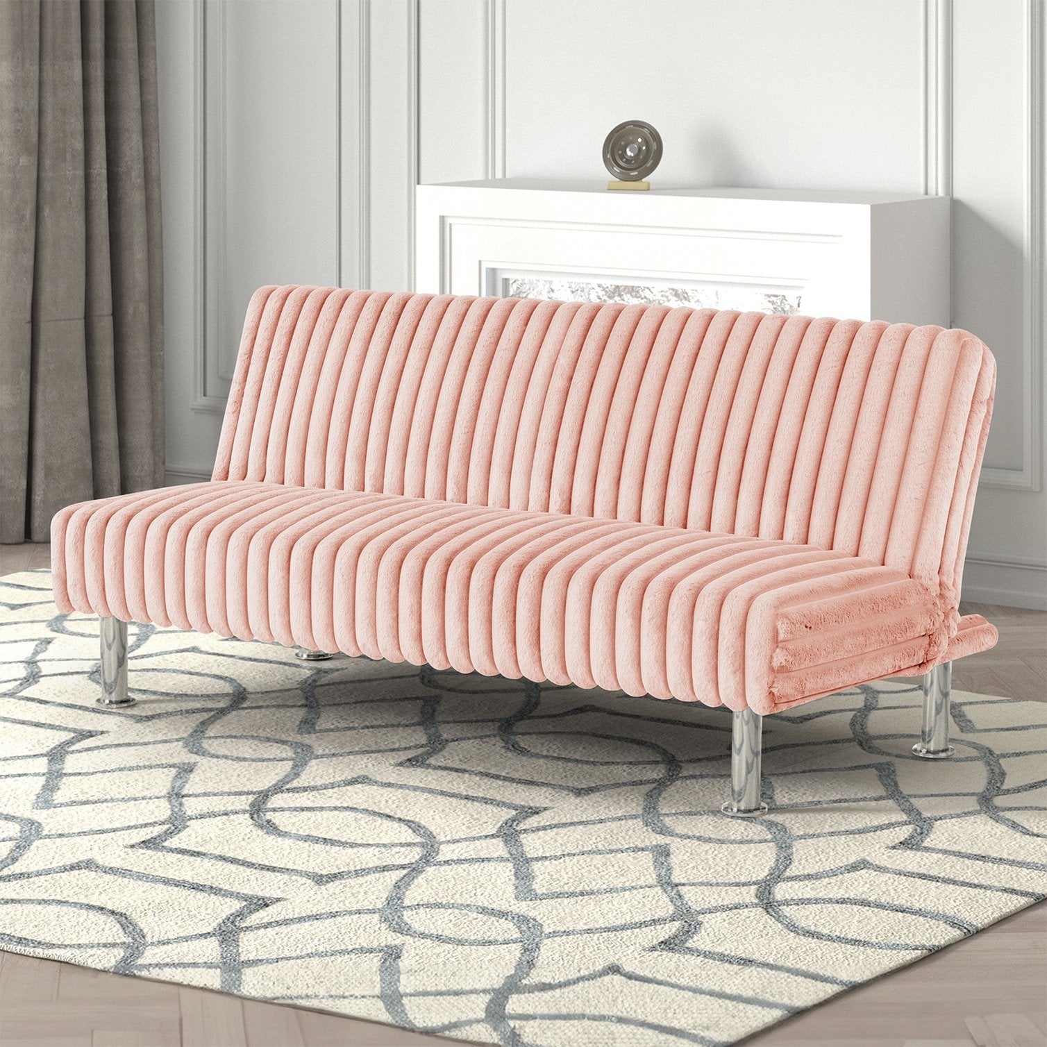 This contemporary pink futon sofa bed blends modern style with practical versatility — a compact seating solution that easily converts to a comfortable sleeper. Upholstered in soft pink fabric over foam cushioning and supported by chrome-finish metal legs, it offers a sleek look and sturdy construction ideal for small living rooms, guest rooms, or studio apartments.