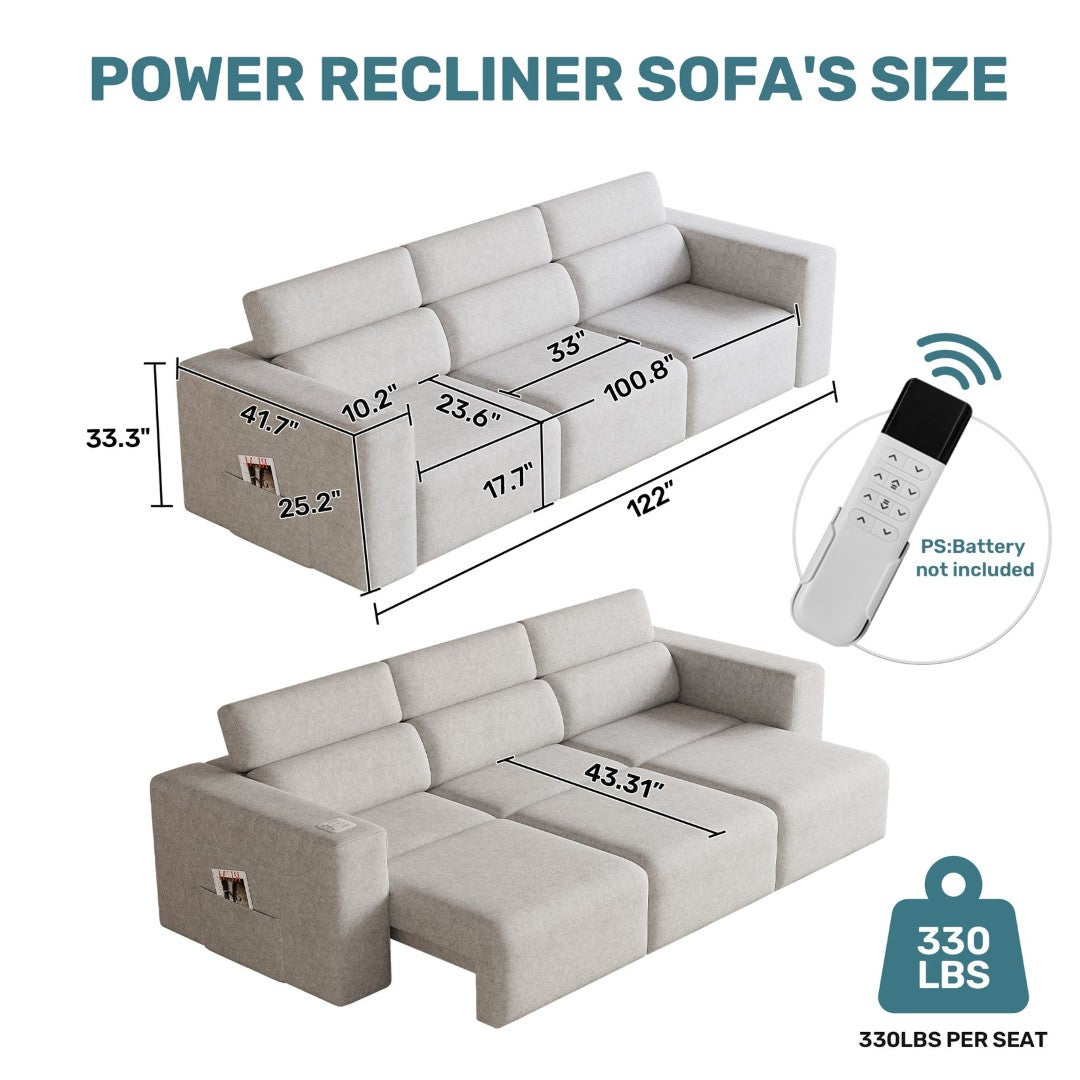 - Upgrade your relaxation with our Power Recliner Sofa! Featuring remote-controlled seat depth adjustment, effortlessly extend the seat to support your legs for zero-gravity comfort. Dual control modes: customize individual seats or sync all three to transform into a spacious reclining bed. Headrests can be adjusted manually. Perfect for napping, lounging, or movie nights!