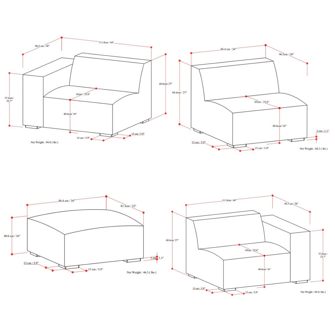 - Key dimensions: Sofa module dimensions: 38" D x 122" W x 27" H; Ottoman dimensions: 32" D x 34" W x 16" H. (Additional product listing dimension: 48 L x 41 W x 65 H.)