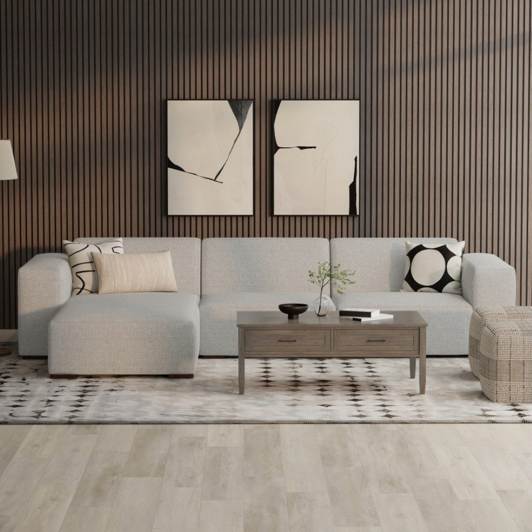 Bring home contemporary comfort with the Rex two-seater sofa and left chaise—an eco-conscious, handcrafted sectional designed for everyday living. Its clean, boxy silhouette and generous proportions create a welcoming lounge that supports up to four people, combining durable construction with soft, easy-care performance fabric and thoughtful details like extra-wide armrests and included throw pillows.