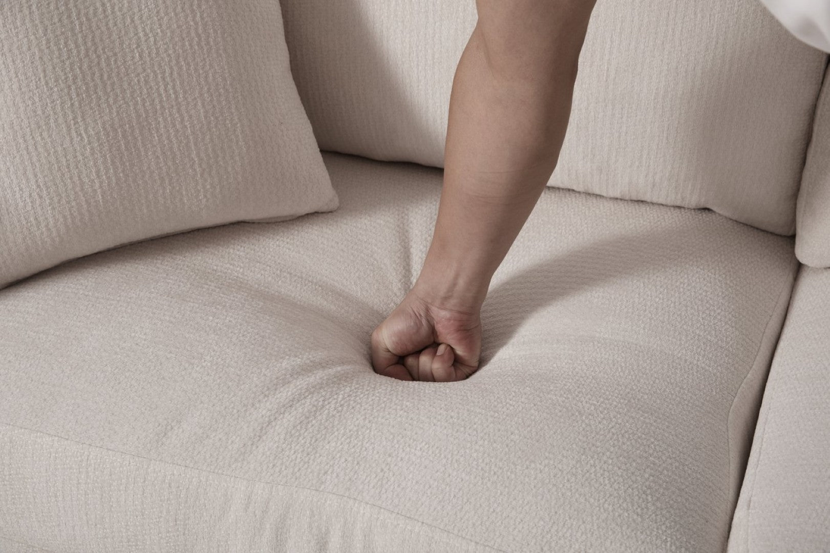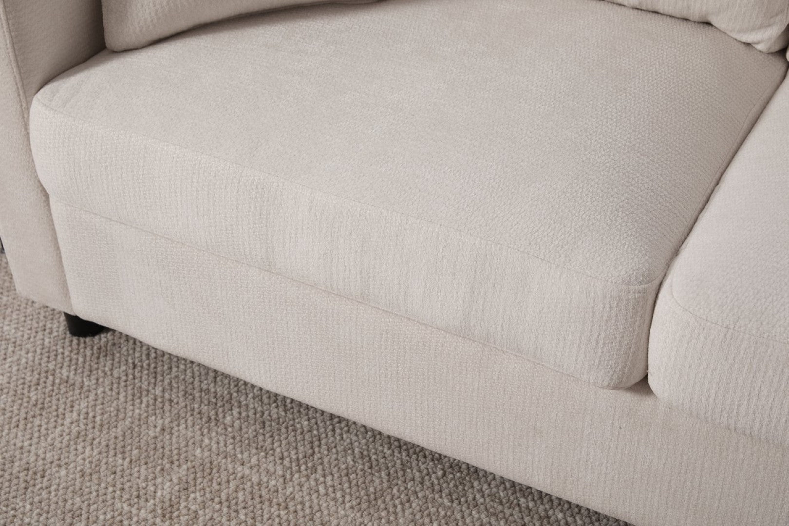 - Upholstery & cushions: Soft, durable polyester fabric in beige with three thick back cushions and riveted armrest details for a modern, tailored look.
