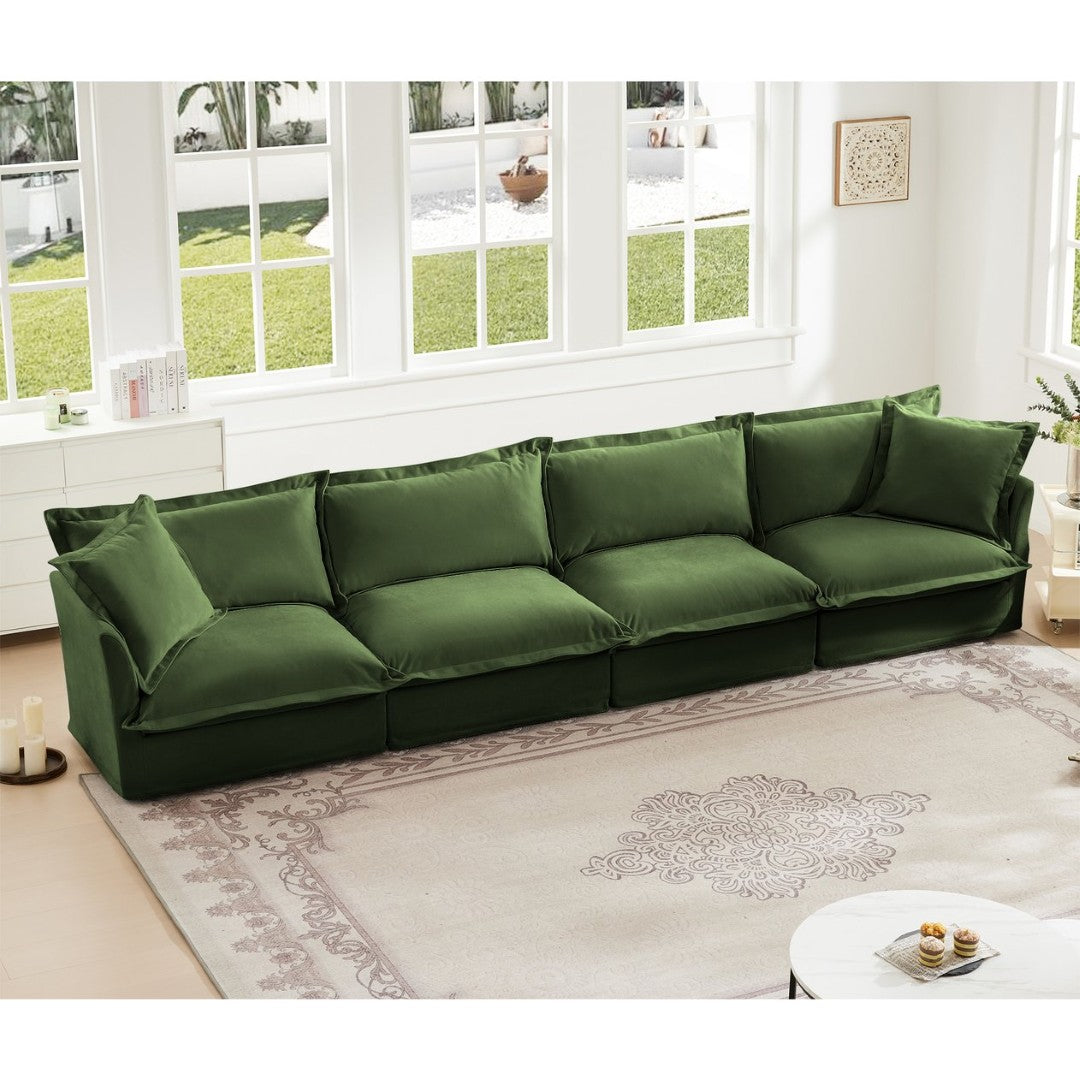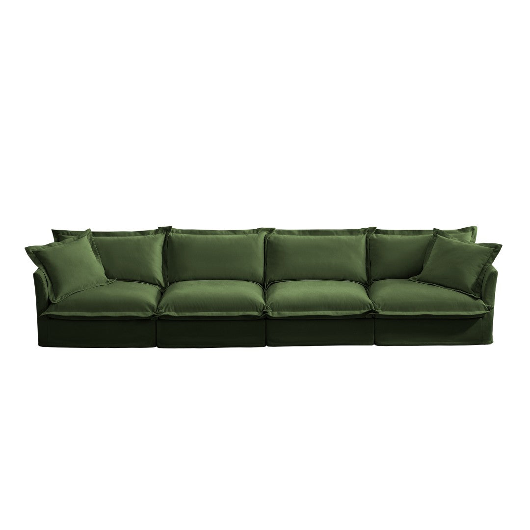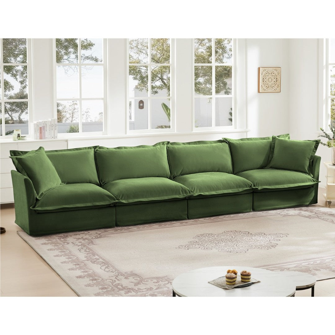 Sink into cloud-like comfort with this versatile slipcovered long sofa—designed for spacious living rooms and flexible layouts. Upholstered in soft green chenille and filled with premium sponge and cotton, it pairs cozy, high-back support with a modern, elegant silhouette. Removable, machine-washable covers and a sturdy hardwood frame make it a practical choice for family life, while modular sections let you customize seating for lounging, entertaining, or home theater setups.