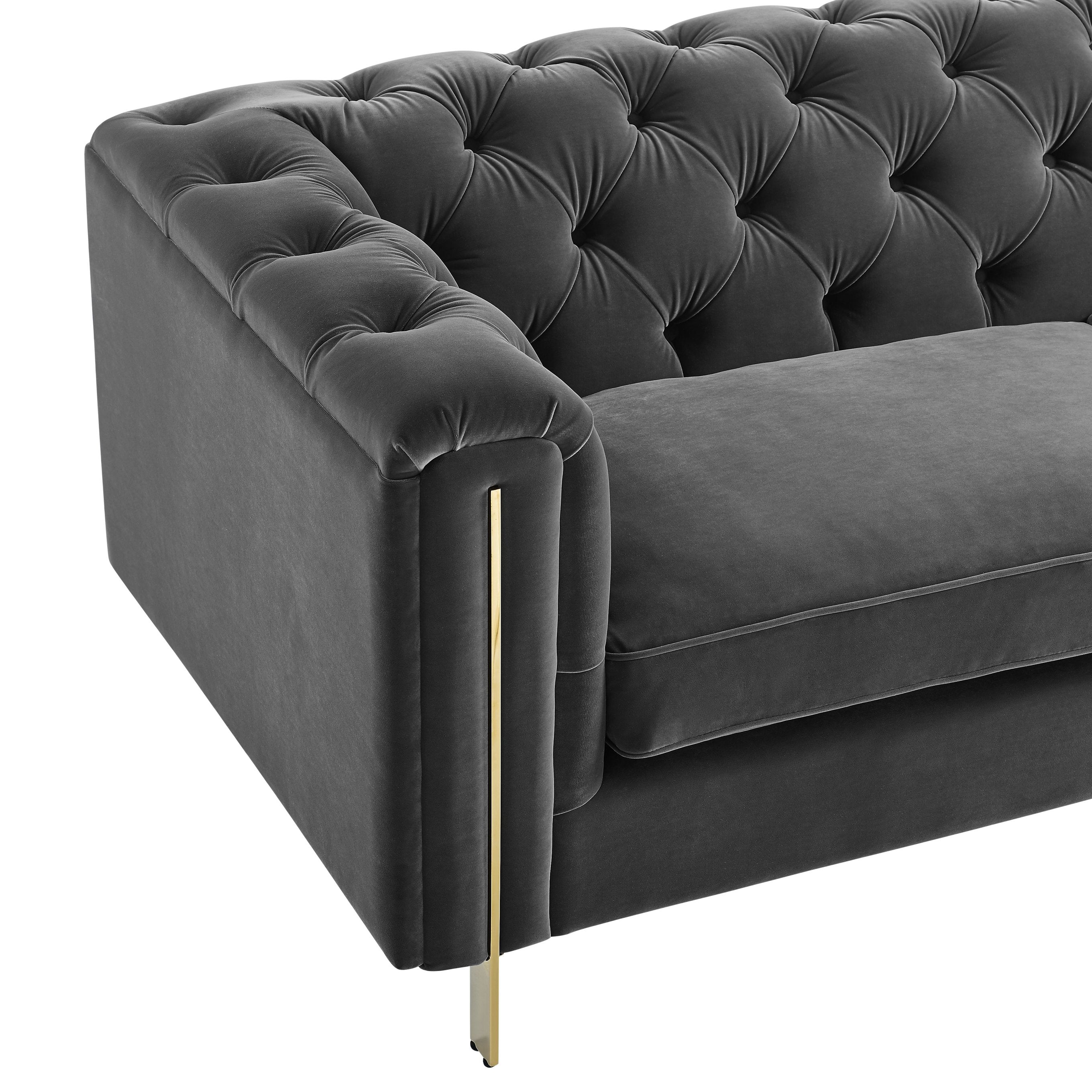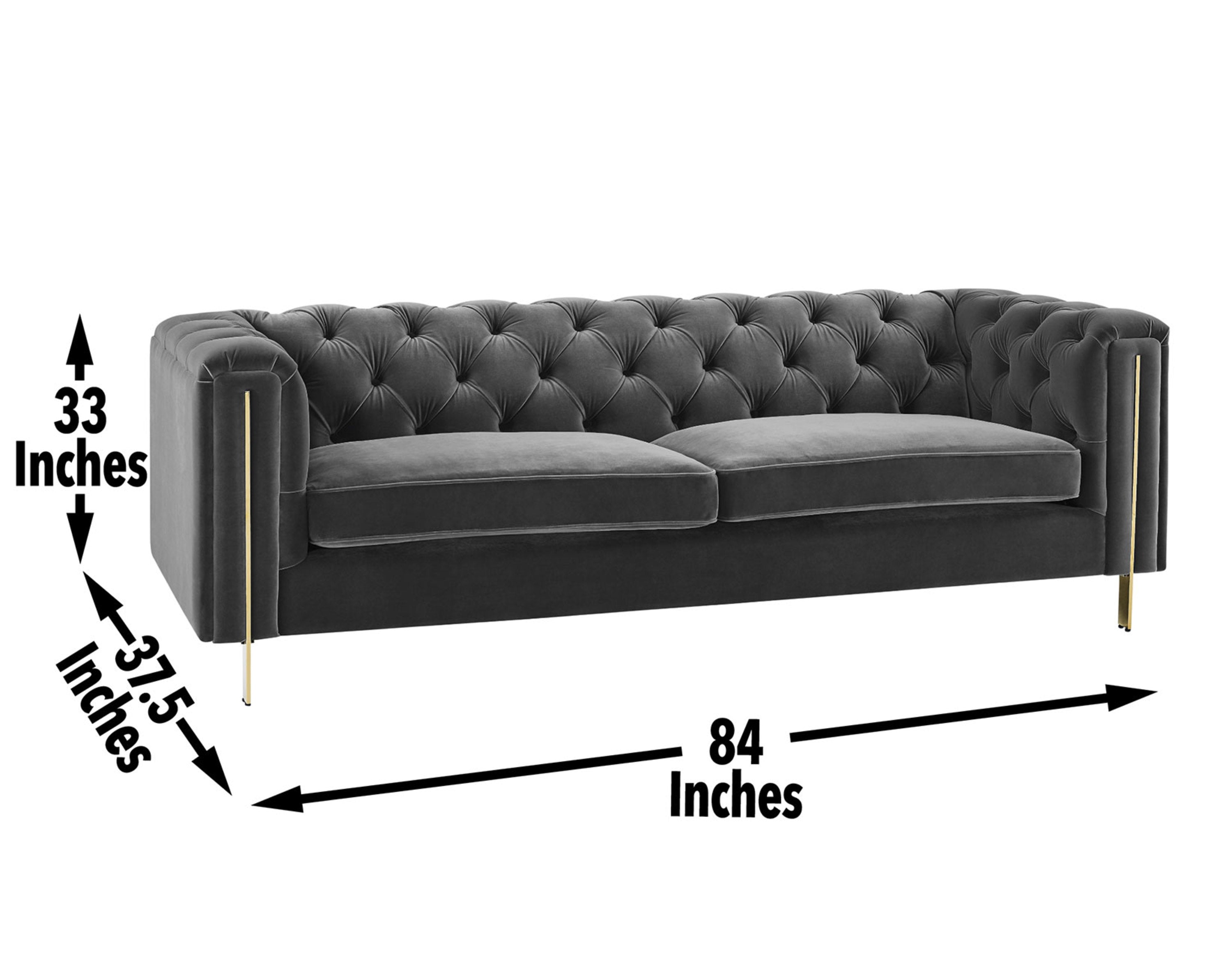 Experience timeless elegance and modern comfort with this gray velvet button-tufted sofa. Its Chesterfield-inspired rolled arms, refined brass-accented details, and plush seating make it a standout piece for living rooms, apartments, or sophisticated office lounges. Designed for both style and durability, it offers easy assembly and versatile placement—perfect as a standalone focal point or paired with additional seating for larger areas.