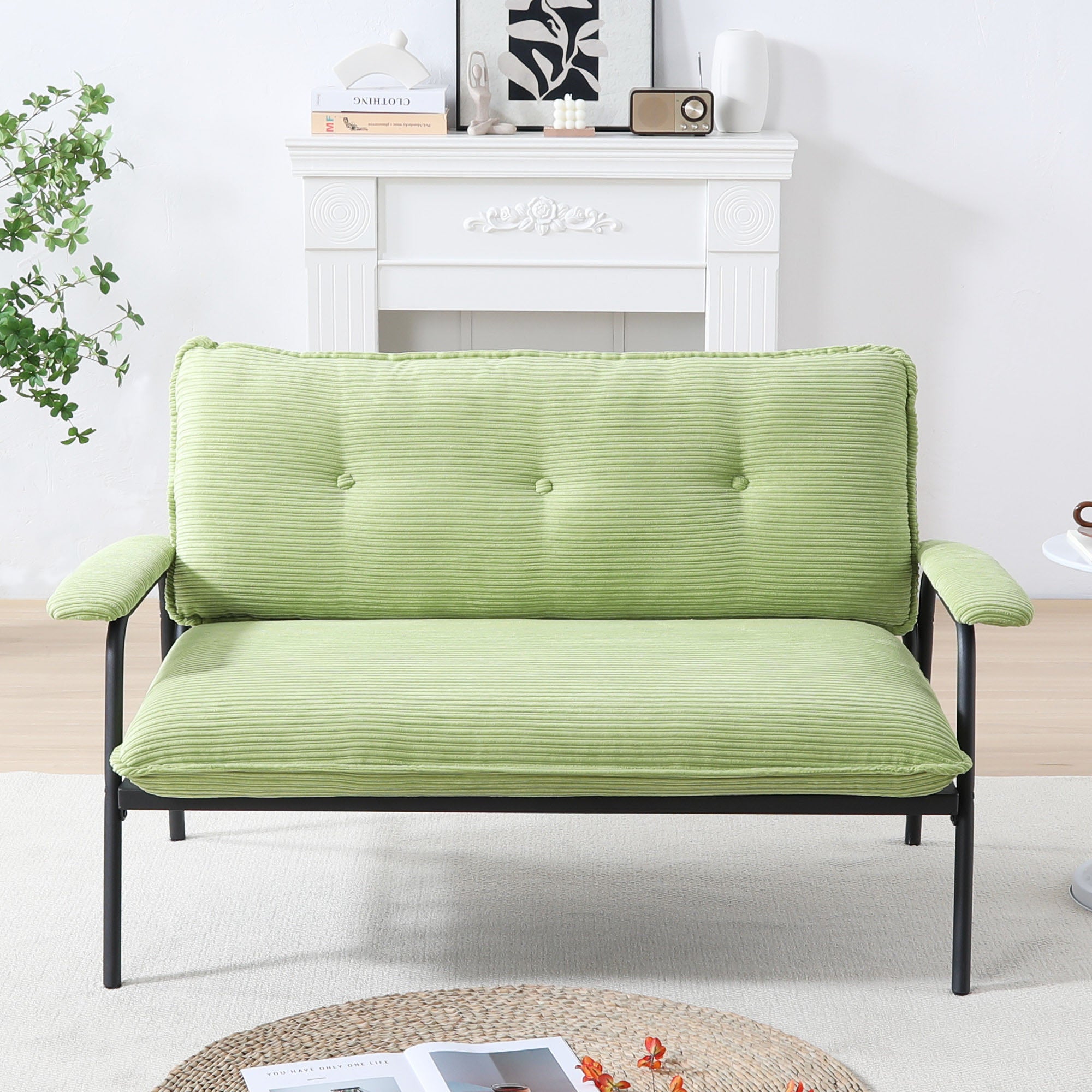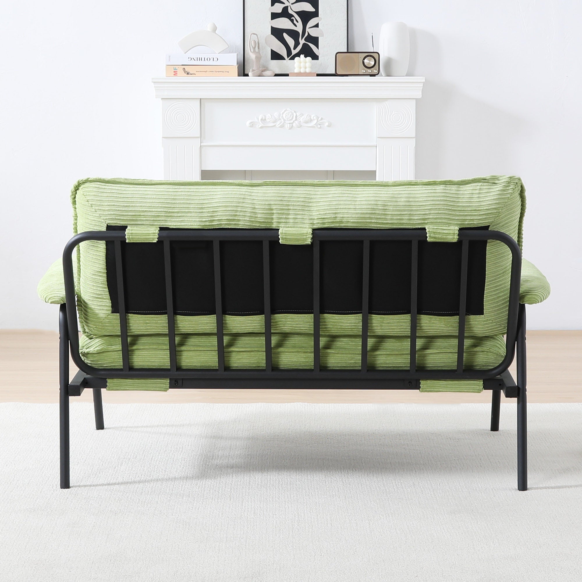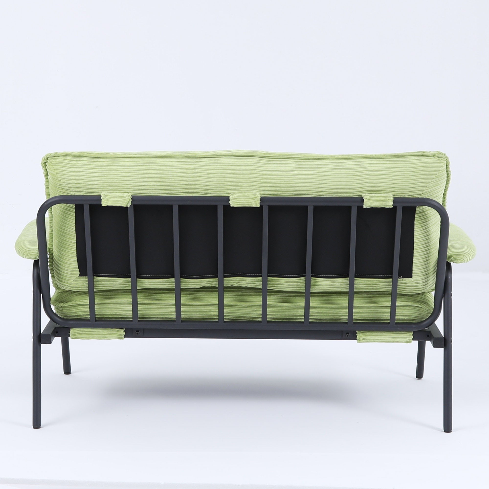 - The exterior design features a simple and modern style. The fresh green striped fabric is paired with a black metal frame, giving a natural and refreshing visual impression. It also goes well with various American home decoration styles. The backrest adopts a classic button tufted design, adding a sense of refinement and retro charm.