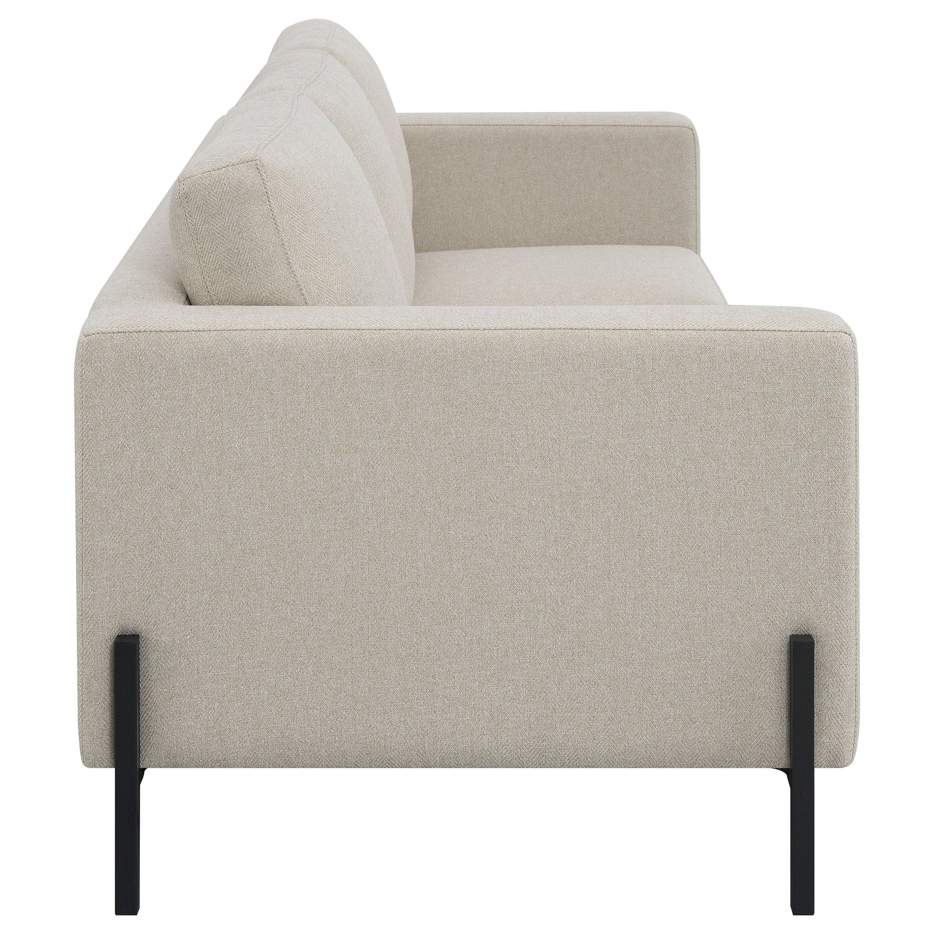 Bring relaxed Mid-Century Modern flair to your living room with this coordinated 3-piece track arm sofa set. Neutral oatmeal herringbone fabric, clean lines, and tall stick-style metal legs combine tailored sophistication with everyday comfort. The set’s attached seats and reversible back cushions provide easy maintenance and lasting support, while the compact silhouettes work well in both transitional and contemporary spaces.