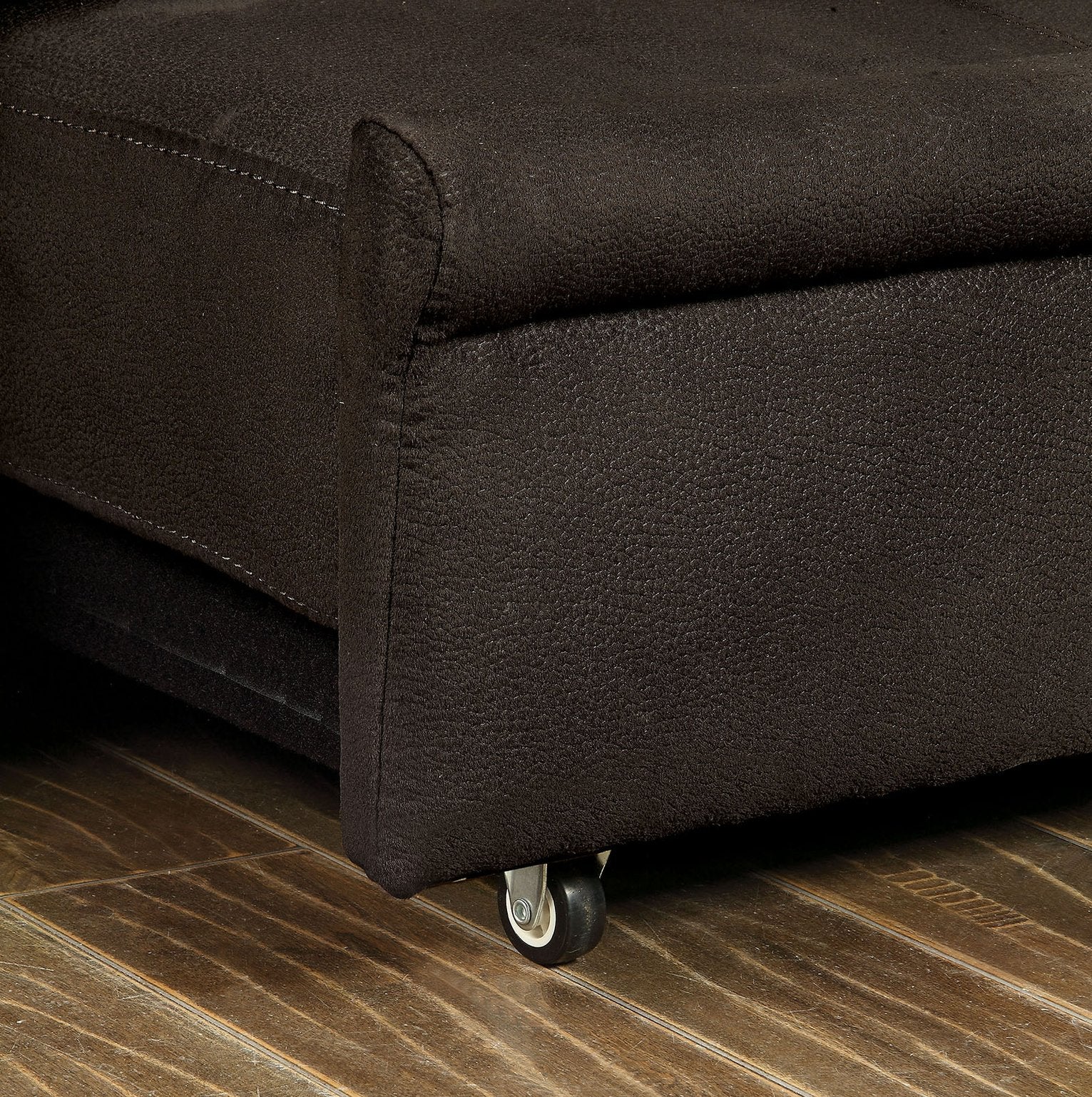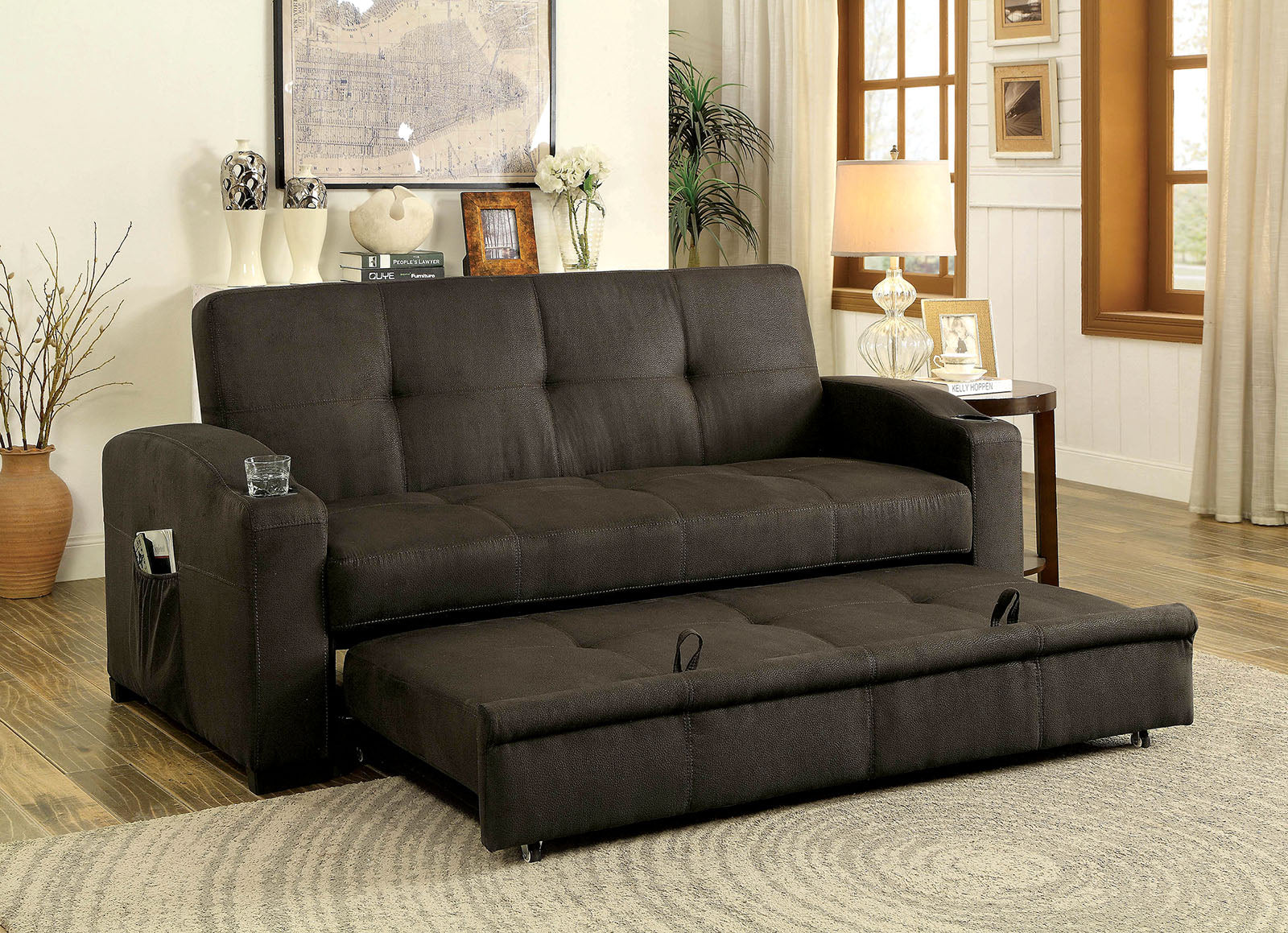 This versatile transitional futon sofa combines style, comfort, and multi-functionality to fit living rooms, entertainment spaces, or a mancave. Upholstered in soft dark brown fabric with button-tufted detailing, it converts easily from sofa to bed and includes handy features like built-in cup holders, side storage pockets, and a pull-out trundle for added sleeping space.