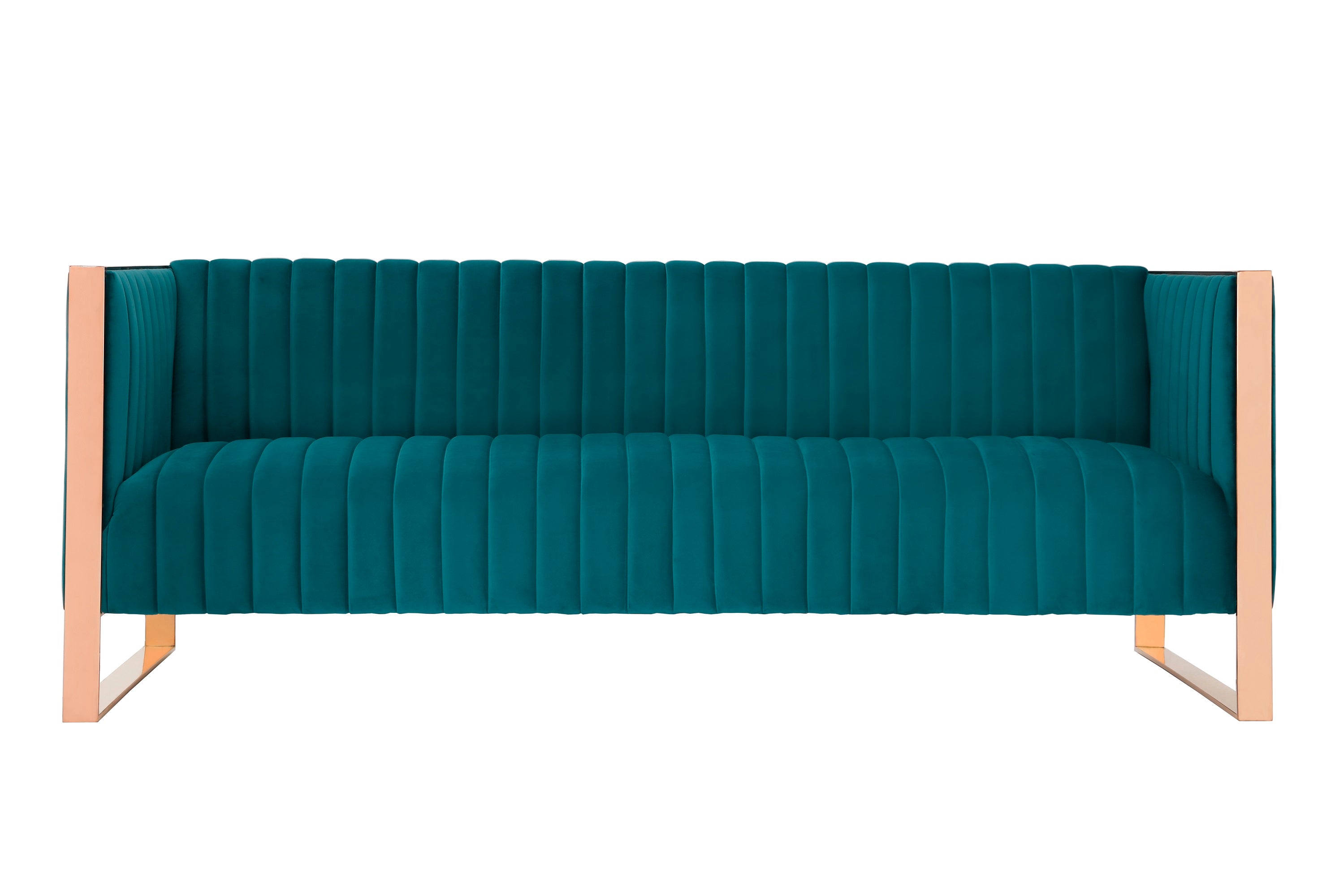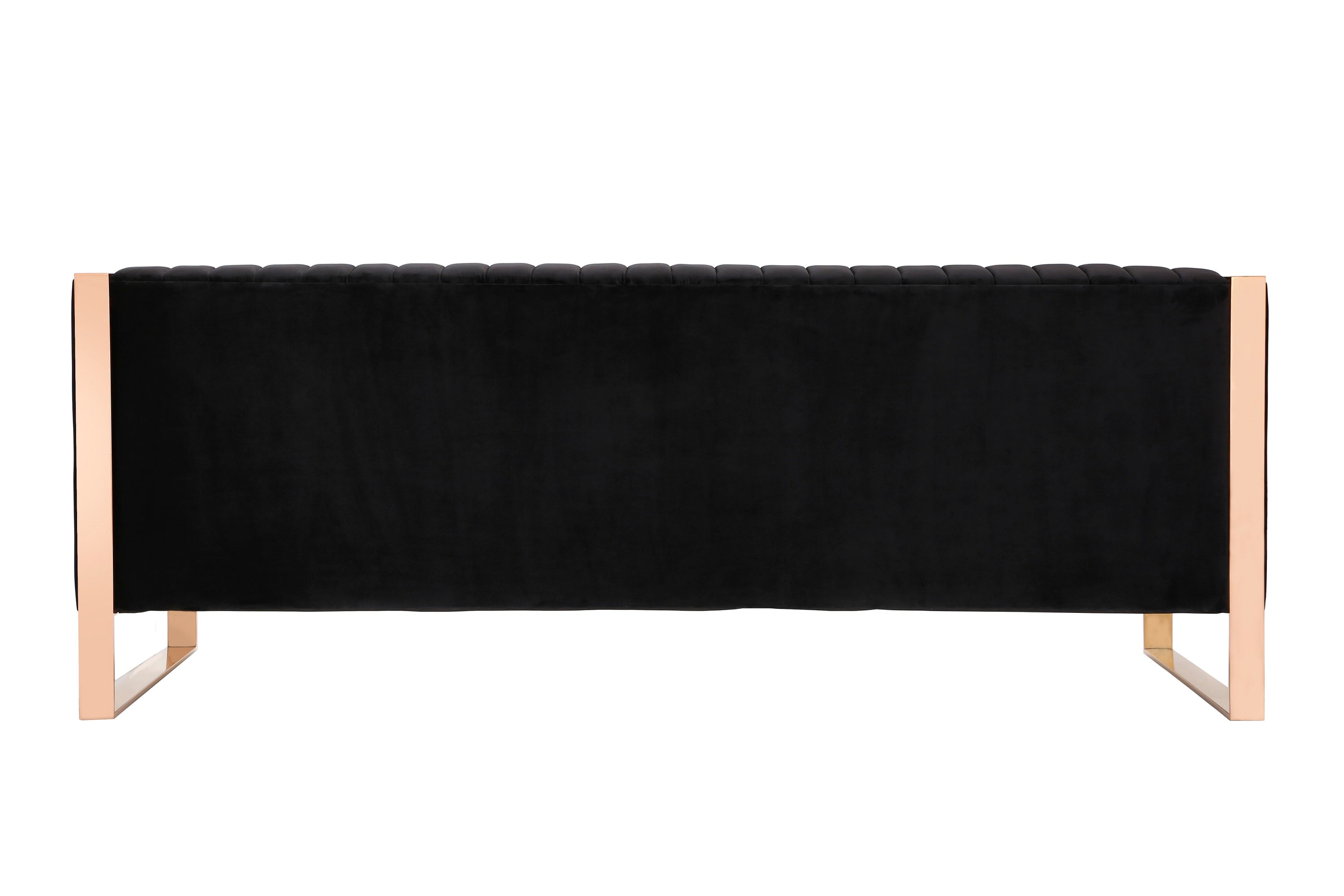 Elevate your living space with the Trillium 83" Velvet Sofa, a refined centerpiece that blends modern glamour with everyday comfort. Upholstered in sumptuous black velvet and supported by a sleek gold-finished stainless steel frame, this sofa offers a polished silhouette, plush seating, and durable construction—ideal for formal sitting rooms or contemporary lounges.