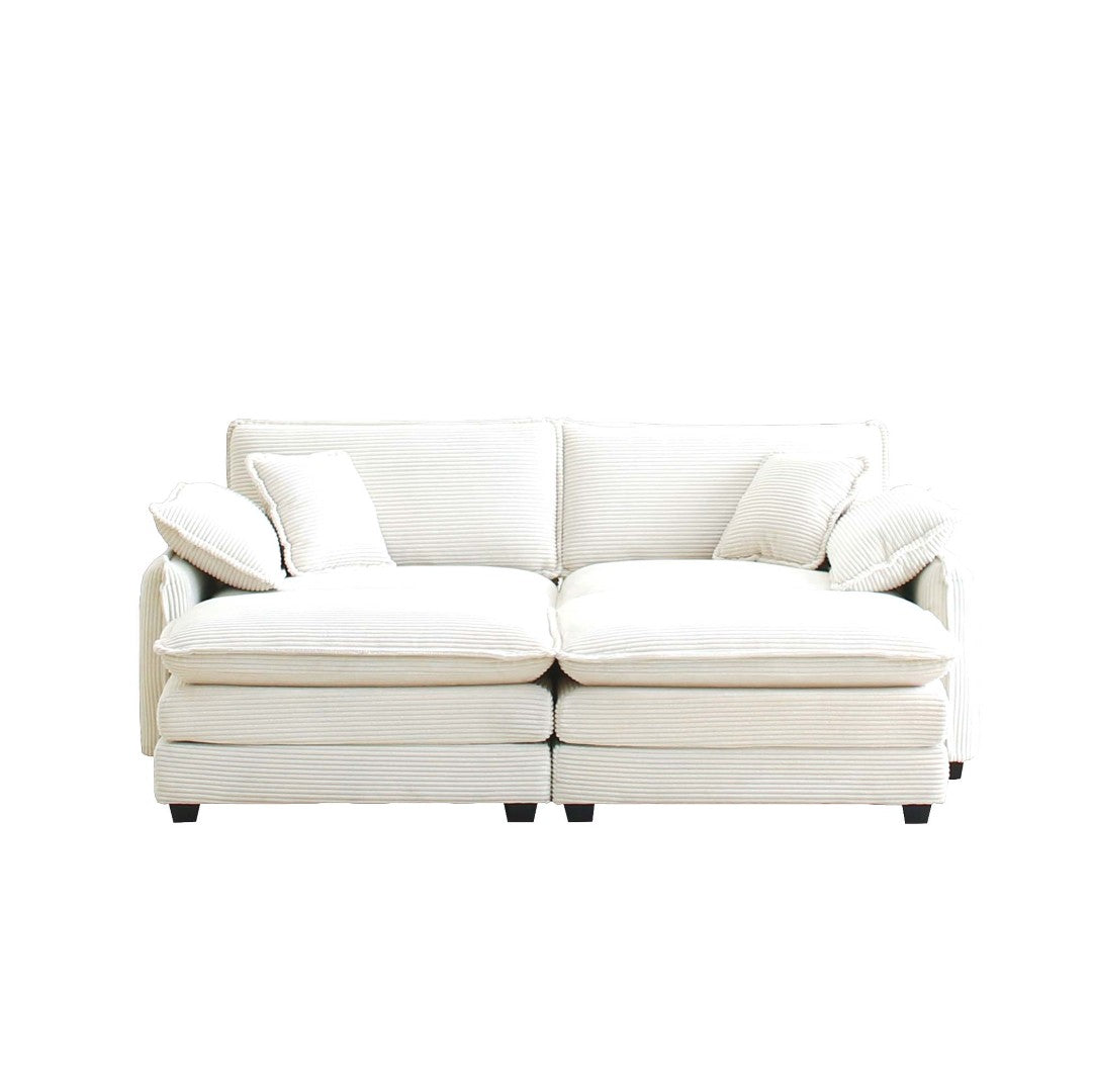 Relax in retro-inspired style with modern comfort—this two-seater theater sofa in plush beige corduroy combines a streamlined silhouette with indulgent cushioning and a matching ottoman to create a cozy, compact seating solution ideal for small living spaces, home cinemas, bedrooms, or studio flats. Designed for both aesthetics and everyday use, it pairs a soft tactile finish with supportive memory-foam seating and removable armrests for customizable comfort.