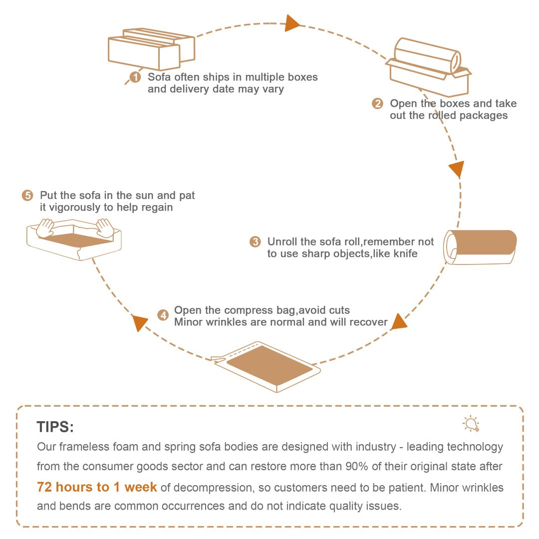 - No Assembly Required: Our modular sofa eliminates the hassle of complicated furniture setup – it's ready to arrange right out of the box. Simply unpack all components and gently pat each module to activate its elasticity, restoring its beautiful shape.