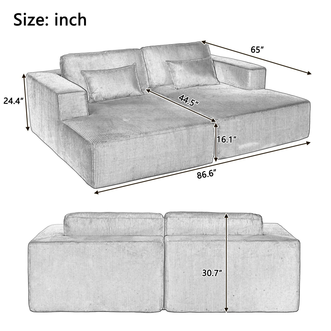 - Key Dimensions: Overall 86.6" W x 65" D x 30.7" H. Seat depth: 44.5". Seat height: 16.1". Arm height: 24.4". (Also listed product dimensions: 49.5" L x 17" W x 16.25" H.)