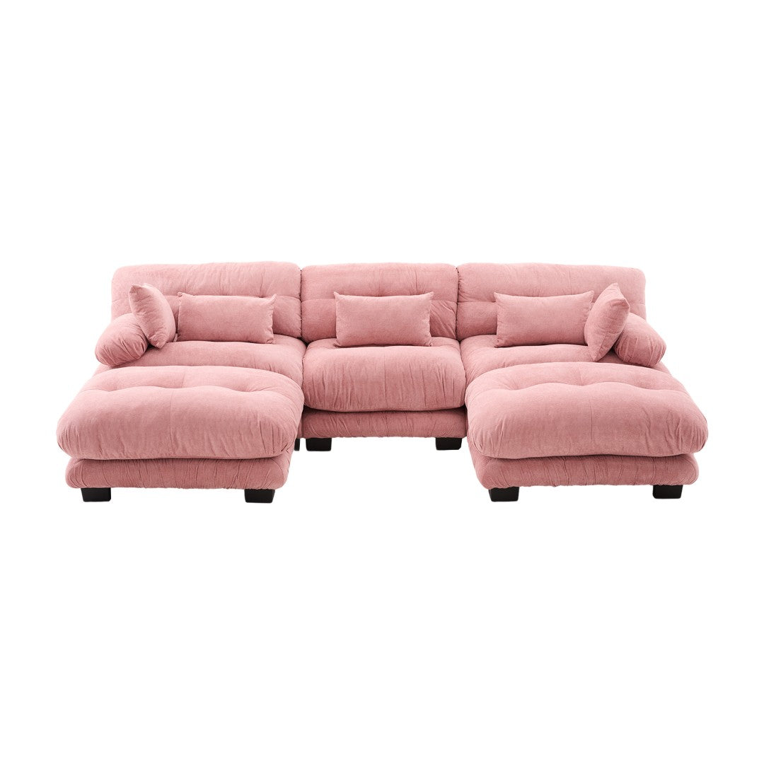 Transform your living space with this cloud-inspired U-shaped modular sofa—designed for exceptional comfort, supportive ergonomics, and flexible configuration. Plush pelletized velvet upholstery and rounded tufted cushions provide a soft, skin-friendly touch while a solid wood frame and high-density foam deliver long-lasting stability. Ideal for relaxing, entertaining, or easing the strain of long sitting, the set includes two ottomans and bolster lumbar pillows to create a cozy, posture-friendly seating area tailored to your room.