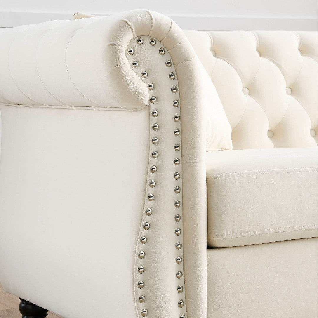 - Upholstery: Plush beige velvet with deep button tufting for a timeless Chesterfield look
