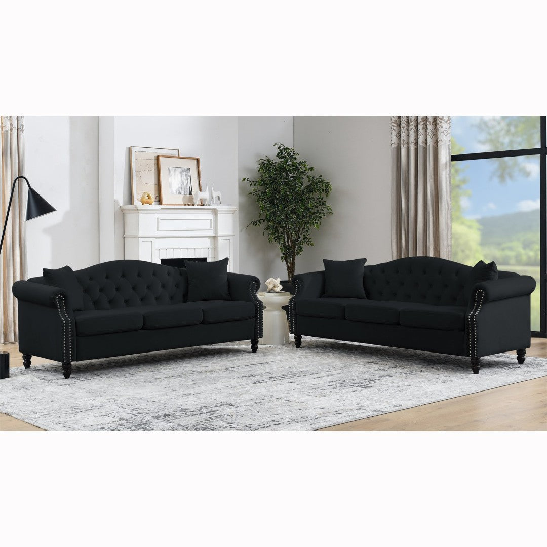 Elevate your living space with this elegant 3-seater Chesterfield-style sofa in luxurious black velvet. Designed for comfort and classic appeal, it pairs deep button tufting, rolled arms, and nailhead trim with a sturdy solid wood and plywood frame—making it a refined focal point for living rooms, bedrooms, offices, or apartments. Includes two matching pillows and delivers supportive seating for everyday use.