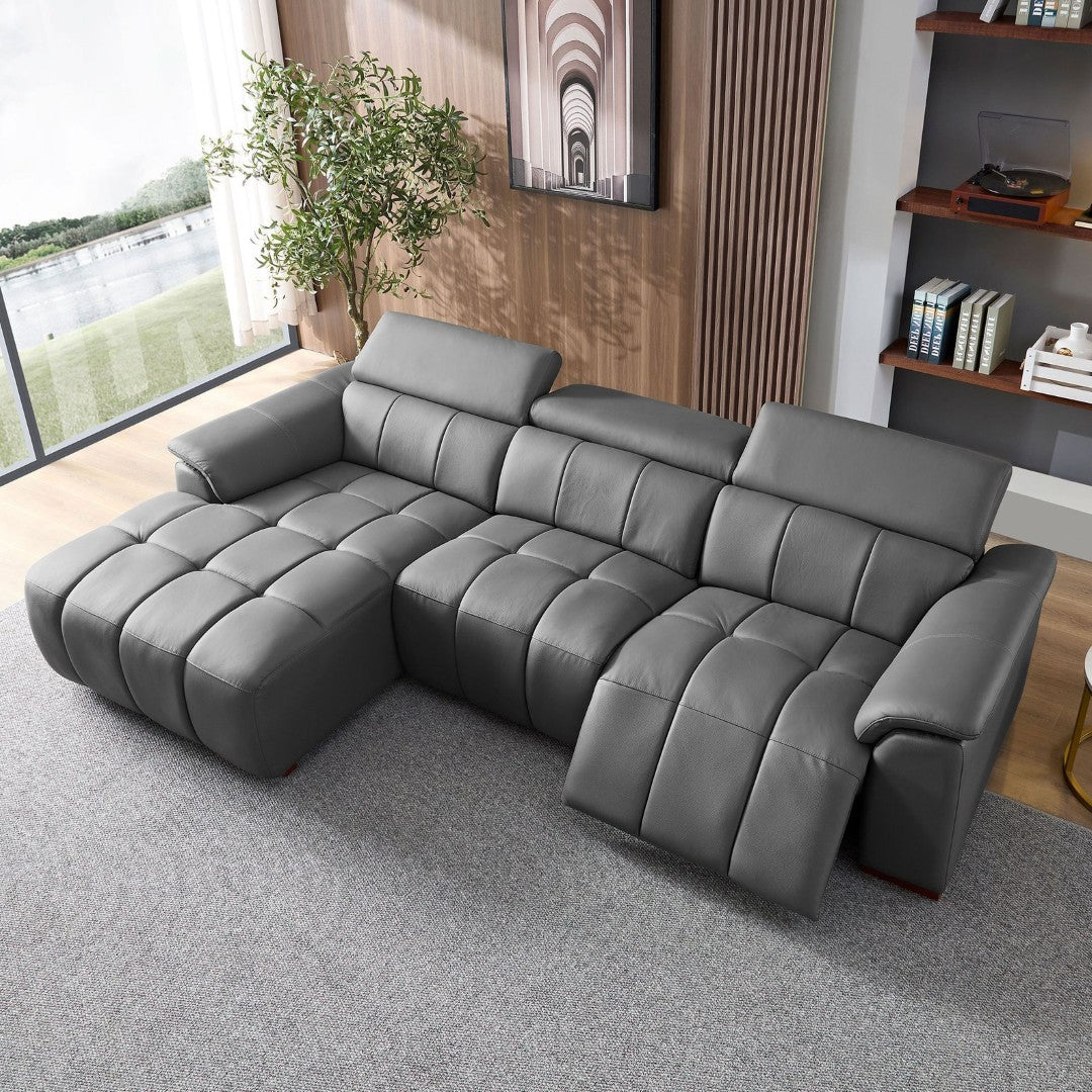Transform your living space with this modern L-shaped wall-hugger reclining sofa that combines genuine leather comfort, electric controls, and practical features for everyday life. Designed for apartments, offices, and home theaters, it offers adjustable headrests and footrests, integrated USB charging, and a streamlined profile that fits close to the wall while delivering full recline and lounge comfort.