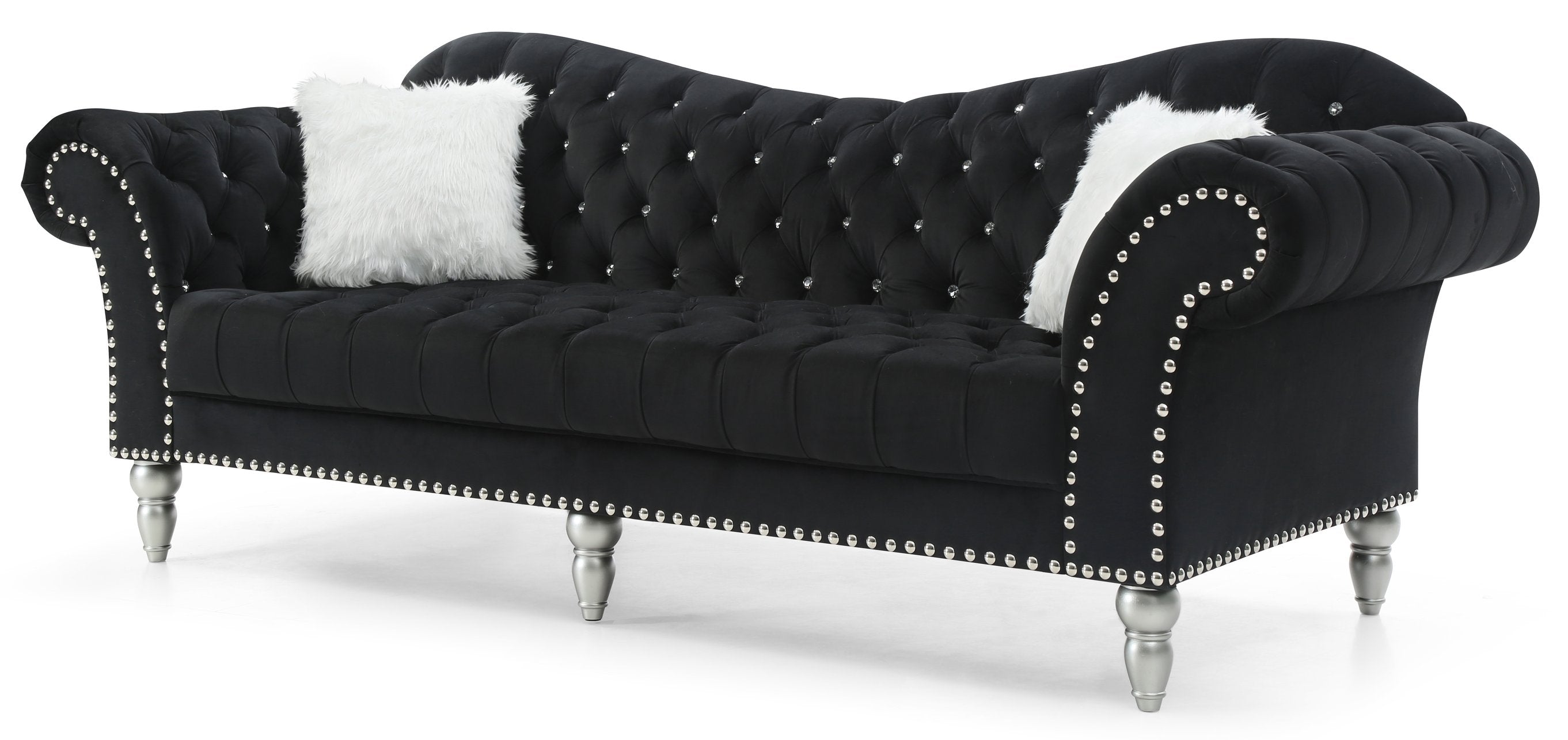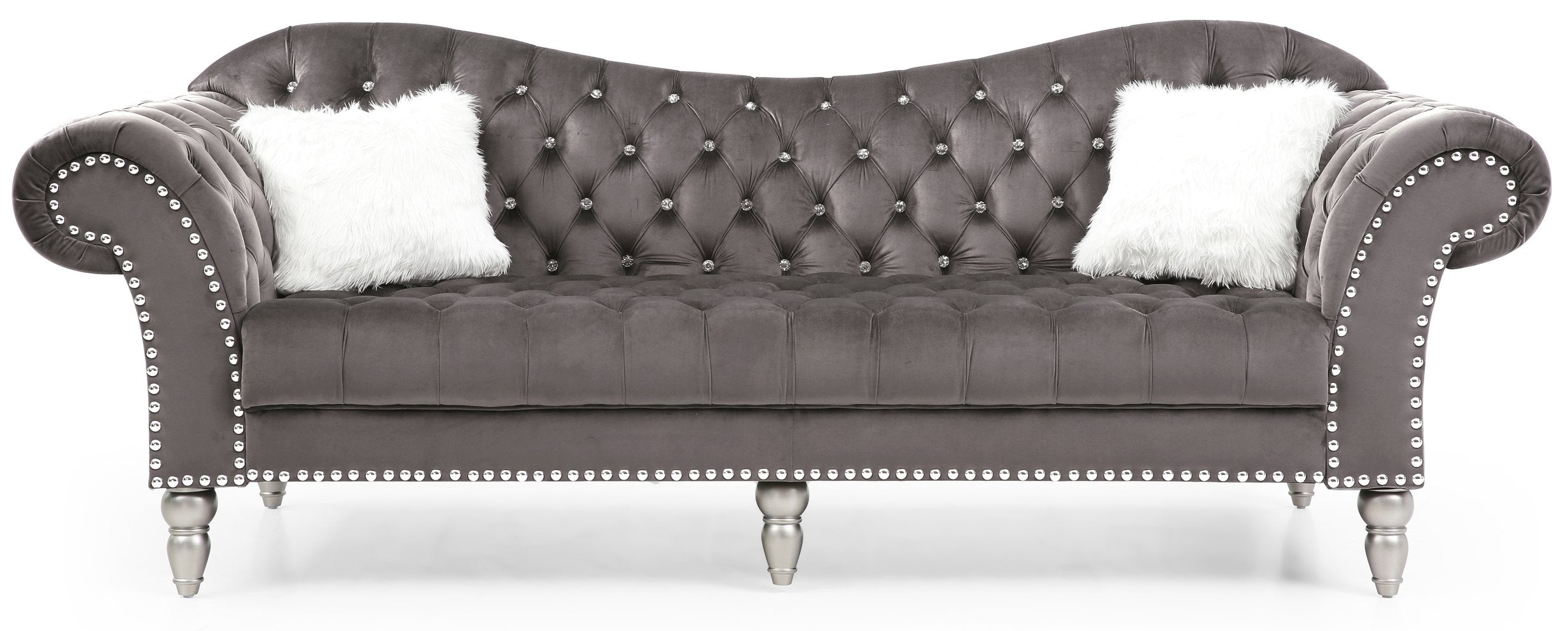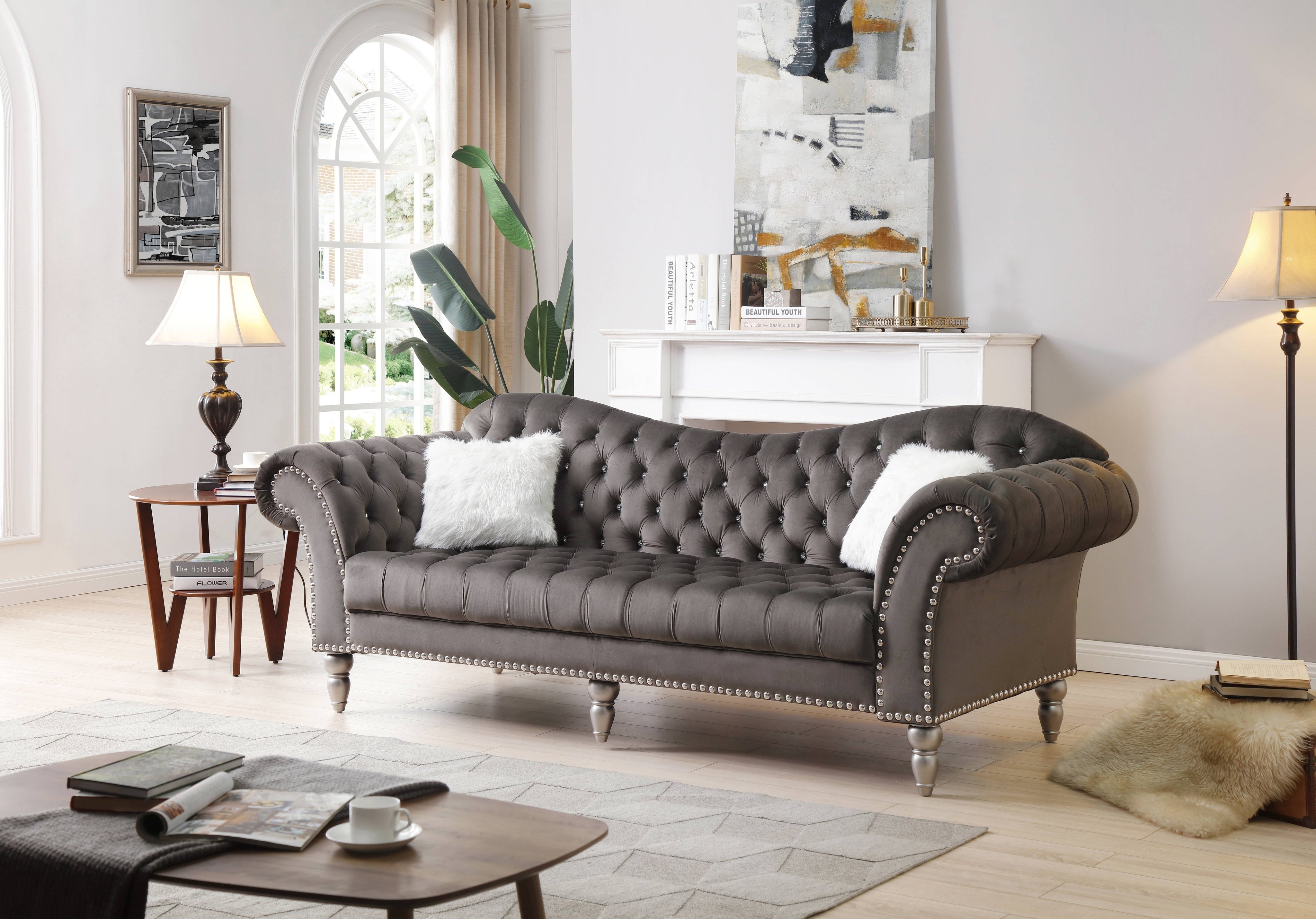 Elevate your living space with the Wilshire sofa — a Deco-inspired statement piece that blends luxurious texture with refined detailing. Crafted for both comfort and style, this dark gray velvet sofa features elegant tufting, contrasting nailhead trim, and a durable hardwood frame, making it an ideal centerpiece for formal and contemporary interiors alike.
