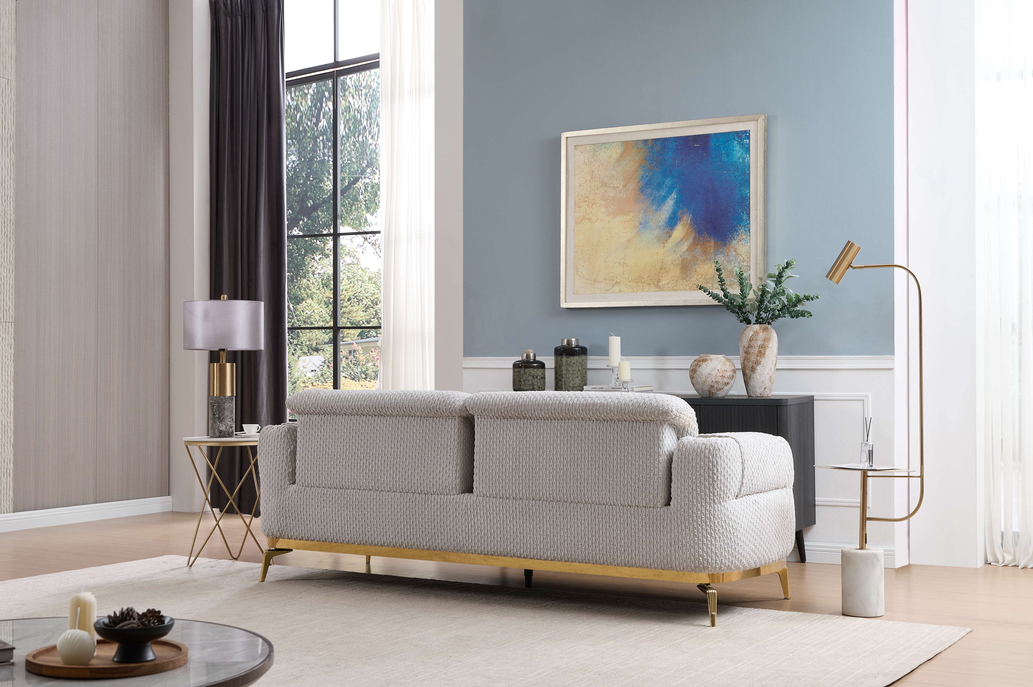 Bring modern glamor and everyday comfort to your living room with this Zoe sofa. Upholstered in soft cut chenille polyester and accented with gold-finished wood details, it pairs contemporary lines with luxurious touches — offering supportive seating with a chic, gallery-ready look.