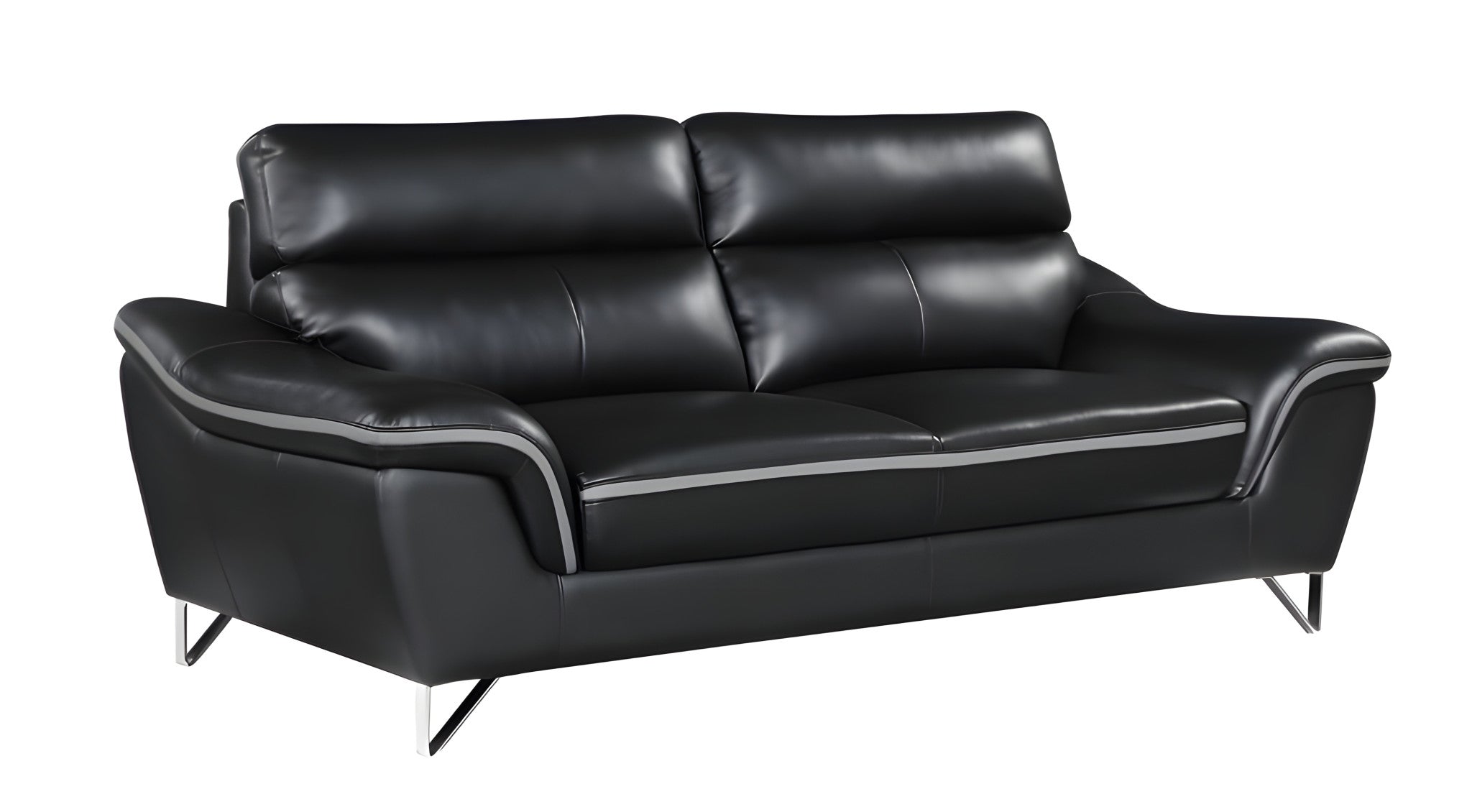 - Stylish black leather sofa with silver legs.