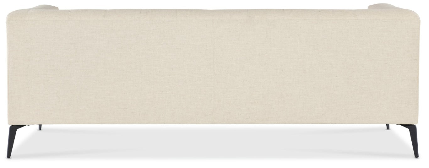 The Nicolla Stationary Sofa blends modern-traditional style with durable, performance-driven materials for a refined and comfortable centerpiece. With a chesterfield-inspired shelter arm silhouette, button-tufted interior, and tall matte black metal tapered legs, it brings a tailored, airy look to living rooms that need both elegance and everyday practicality.