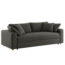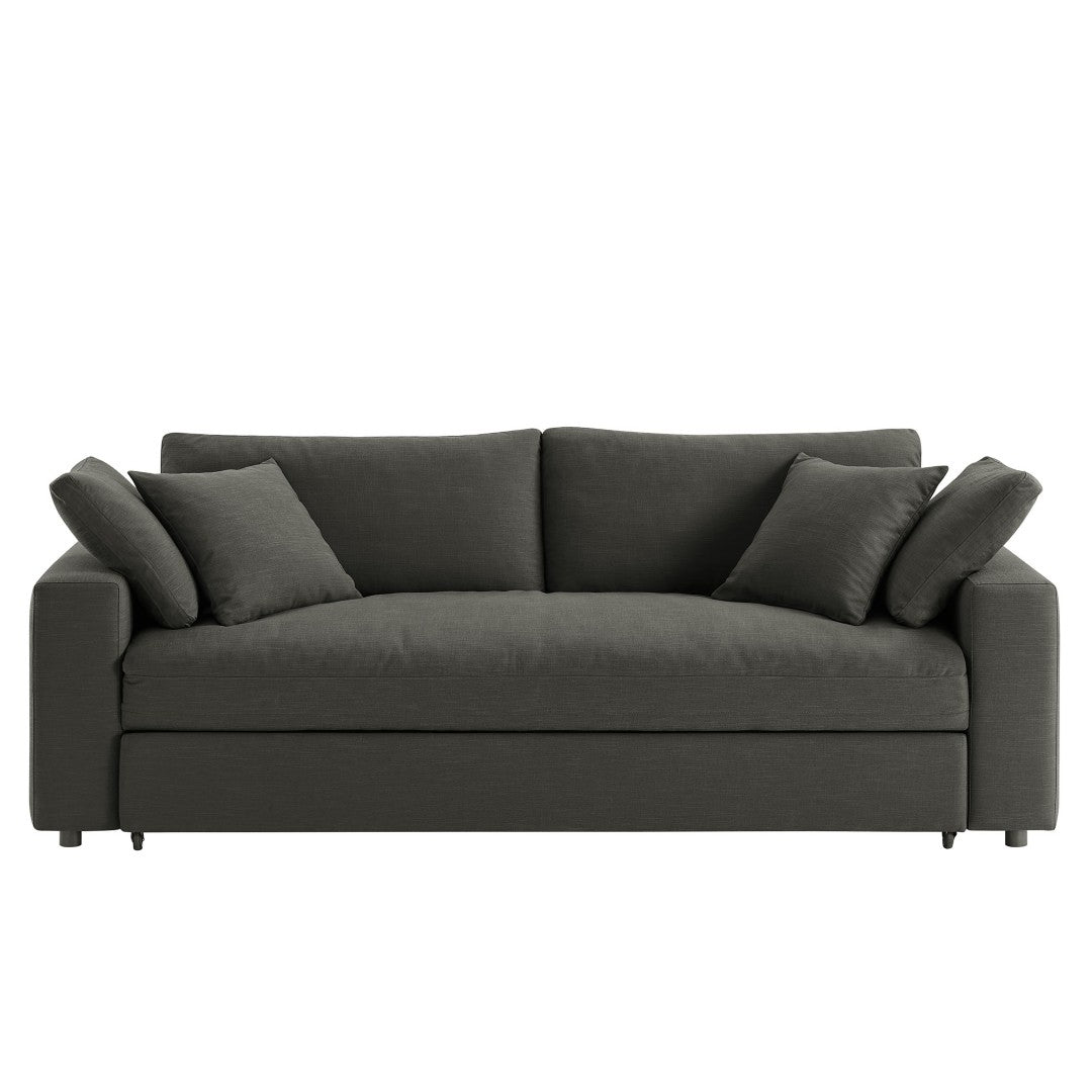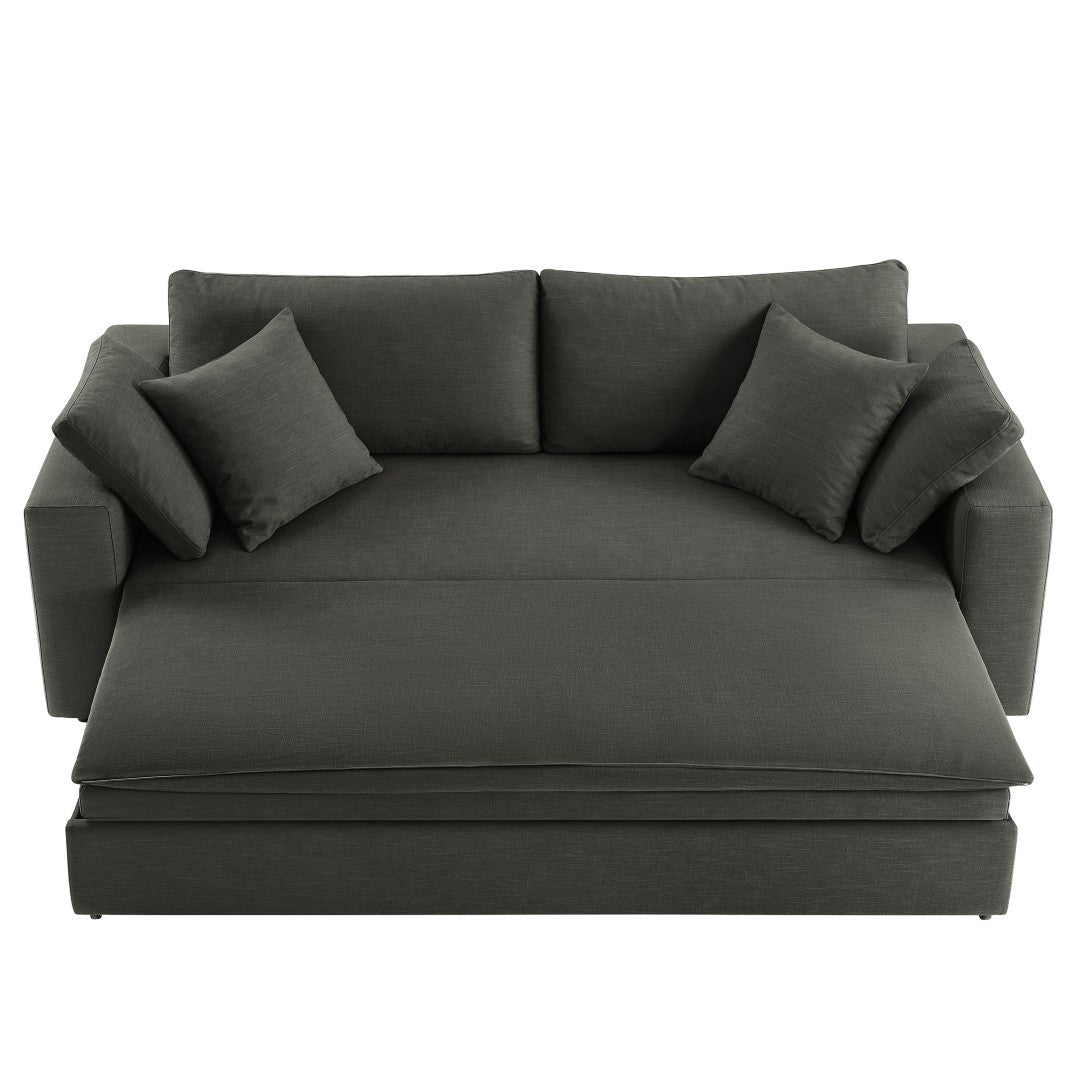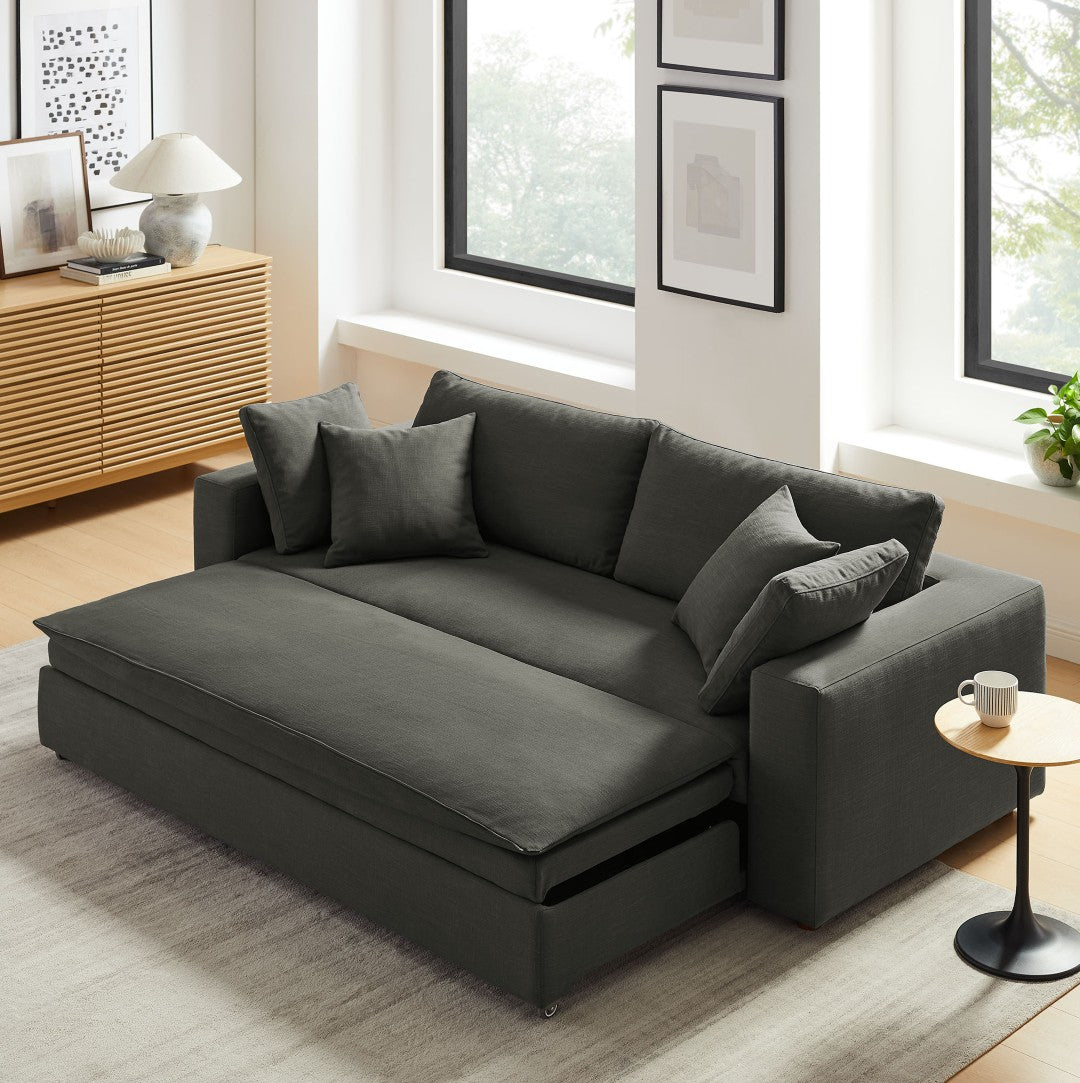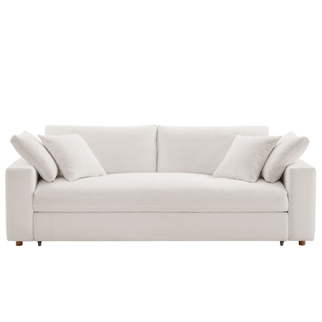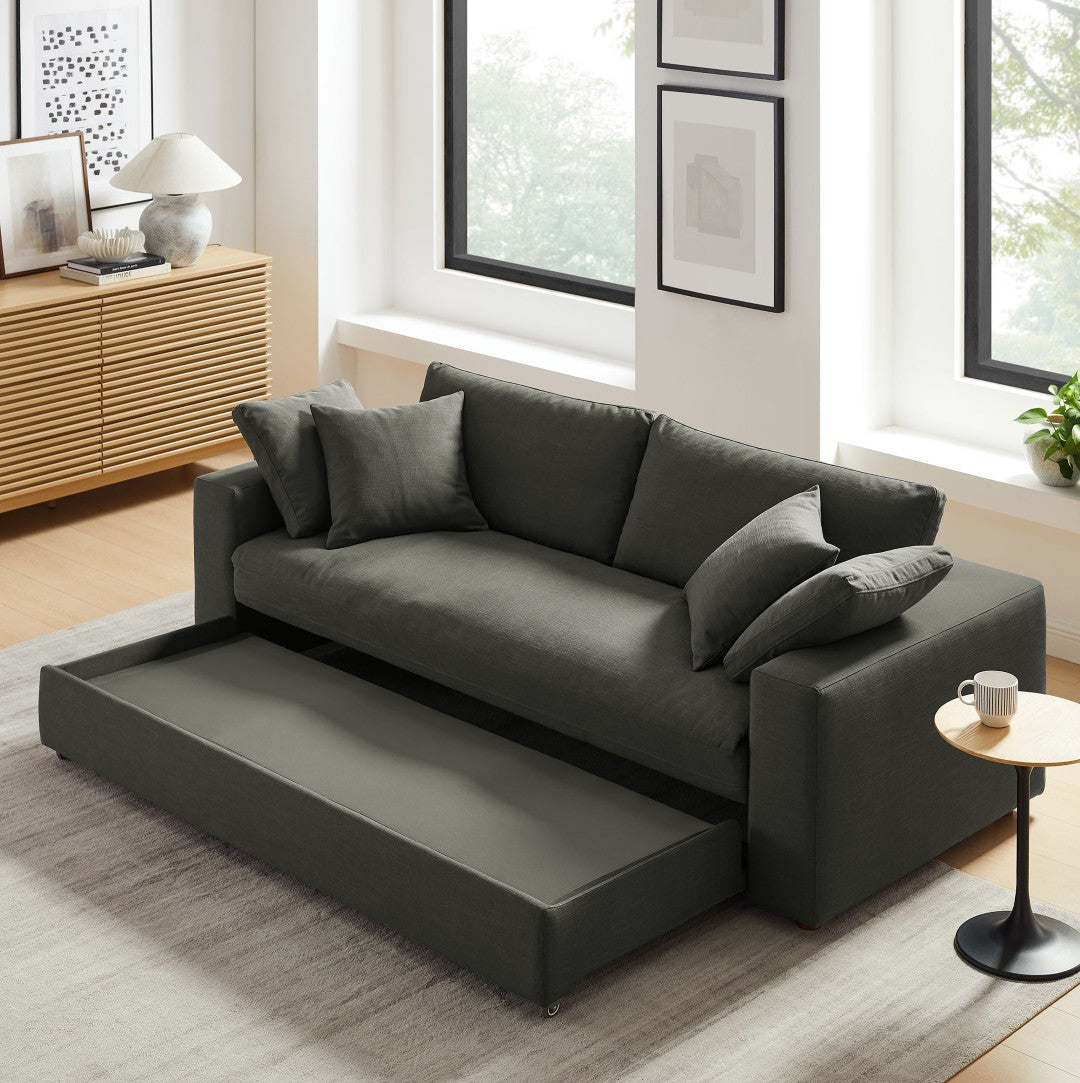 Sink into cloud-like comfort with the Commix down-filled overstuffed sleeper sofa — a versatile centerpiece that blends plush relaxation with modern, clean-lined design. Upholstered in a luxe linen-textured polyester, this roomy 2-in-1 sofa delivers everyday seating for family life and an effortless full-size pull-out bed for overnight guests. Thoughtful details like a solid wood frame, felt floor pads, and included pillows and back cushions make this piece both durable and inviting — no assembly required.