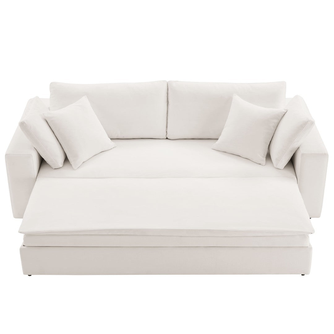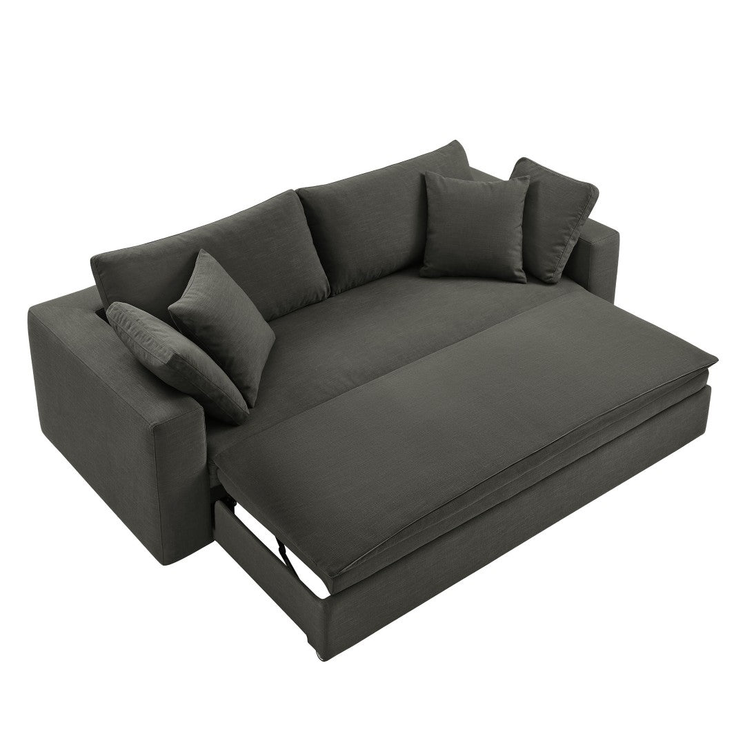 - Durable Linen-Like Upholstery Includes 4 Throw Pillows Easy Pull Out Mechanism Dense Foam Padding Kiln-Dried Hardwood Frame Non-Marking Felt Floor Pads No Assembly Required