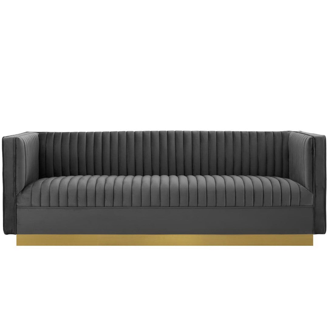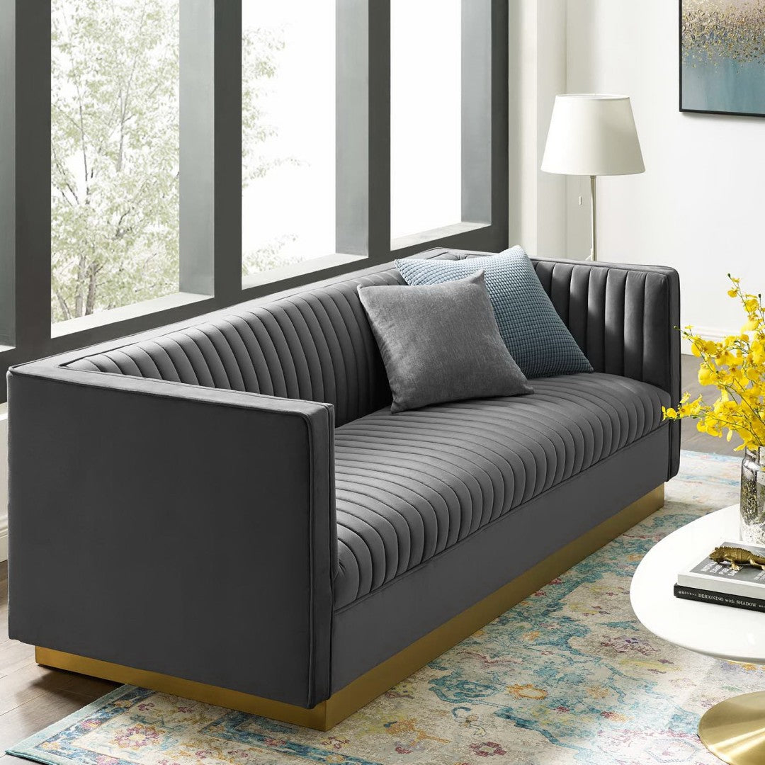 Elevate your living space with a statement sofa that blends retro-modern style and everyday durability. The Sanguine Performance Velvet Sofa features elegant vertical channel tufting, plush cushioning, and a polished gold stainless steel base — a refined centerpiece designed for comfort, resilience, and visual impact in living rooms, lounges, or home offices.