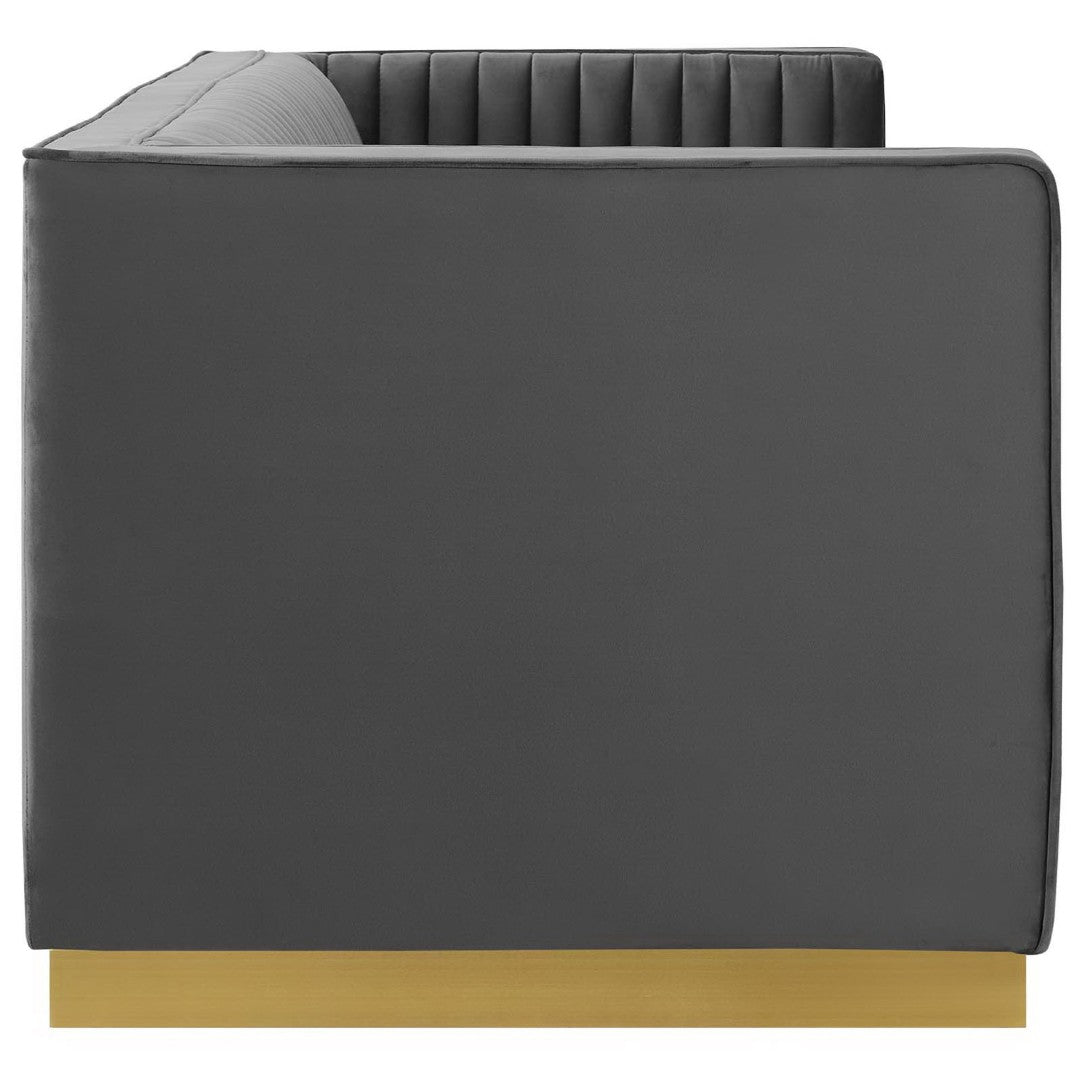 - Channel Tufted Sofa / Couch Performance Velvet Polyester Upholstery Durable Stain-Resistant Fabric Gold Stainless Steel Base Individually-Wrapped Pocket Coils Dense Foam Padding Maximum Weight Capacity: 900 lbs. No assembly required
