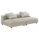 - 2-Piece Modular Sofa Textured Woven Fabric Upholstery Square Accent Pillows Dense Foam Padding Sinuous Spring Support Non-Making Floor Glides Arrives Fully Assembled