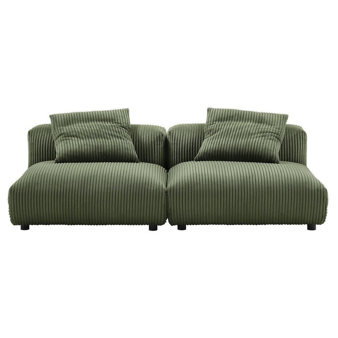 - 2-Piece Modular Sofa Corduroy Upholstery Square Accent Pillows Dense Foam Padding Sinuous Spring Support Non-Making Floor Glides Arrives Fully Assembled