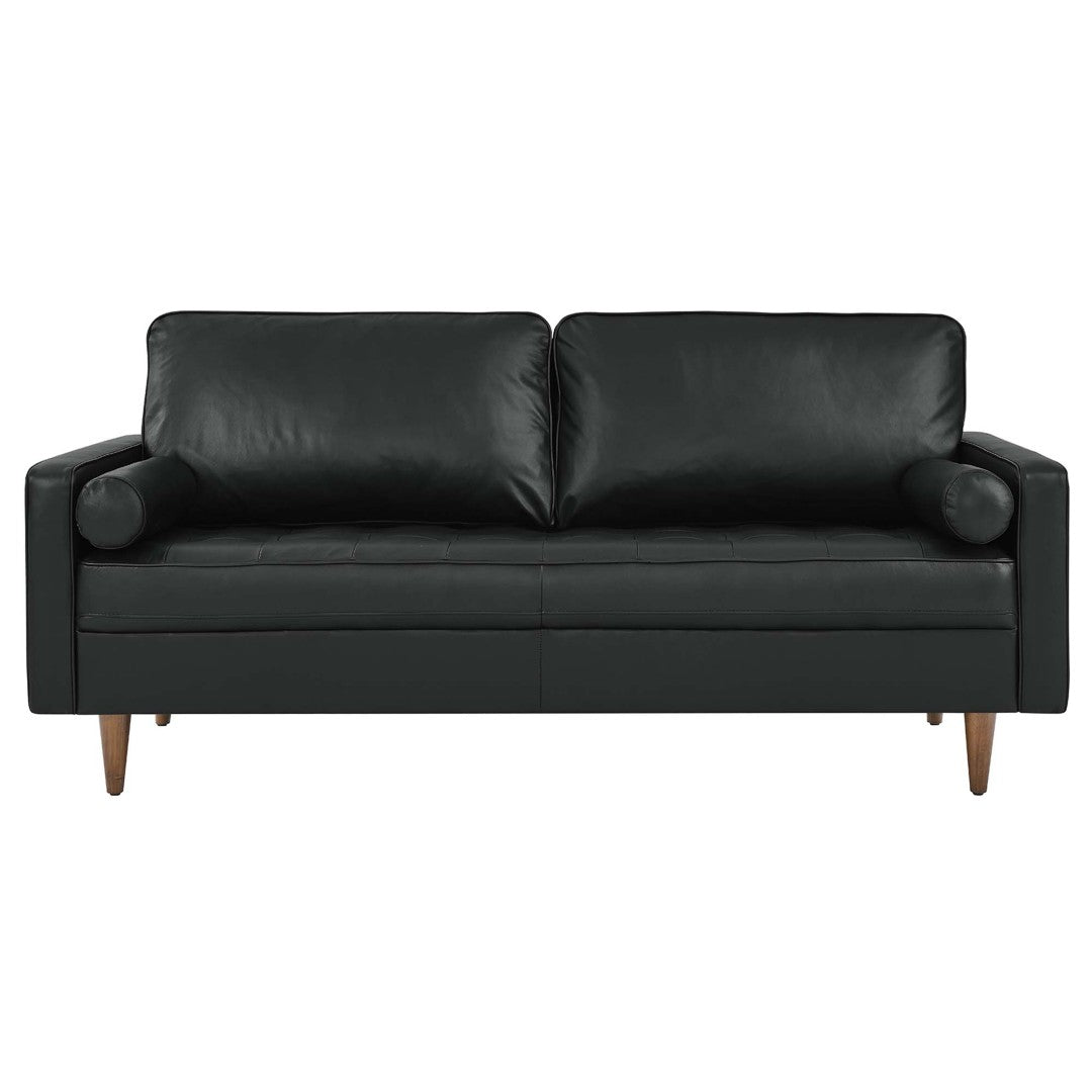 Bring mid-century elegance and modern comfort into compact living spaces with the Valour Leather Sofa by Modway. Expertly tailored with biscuit tufting, top-grain leather upholstery, and walnut-stained wood legs, this small-profile sofa delivers refined style without sacrificing durability or support. Thoughtfully engineered for apartment life, it combines dense foam padding, an innerspring pocket structure, and sinuous spring support for balanced comfort and long-lasting performance. Ships in a portable box for easy maneuvering and supports up to 600 lbs.