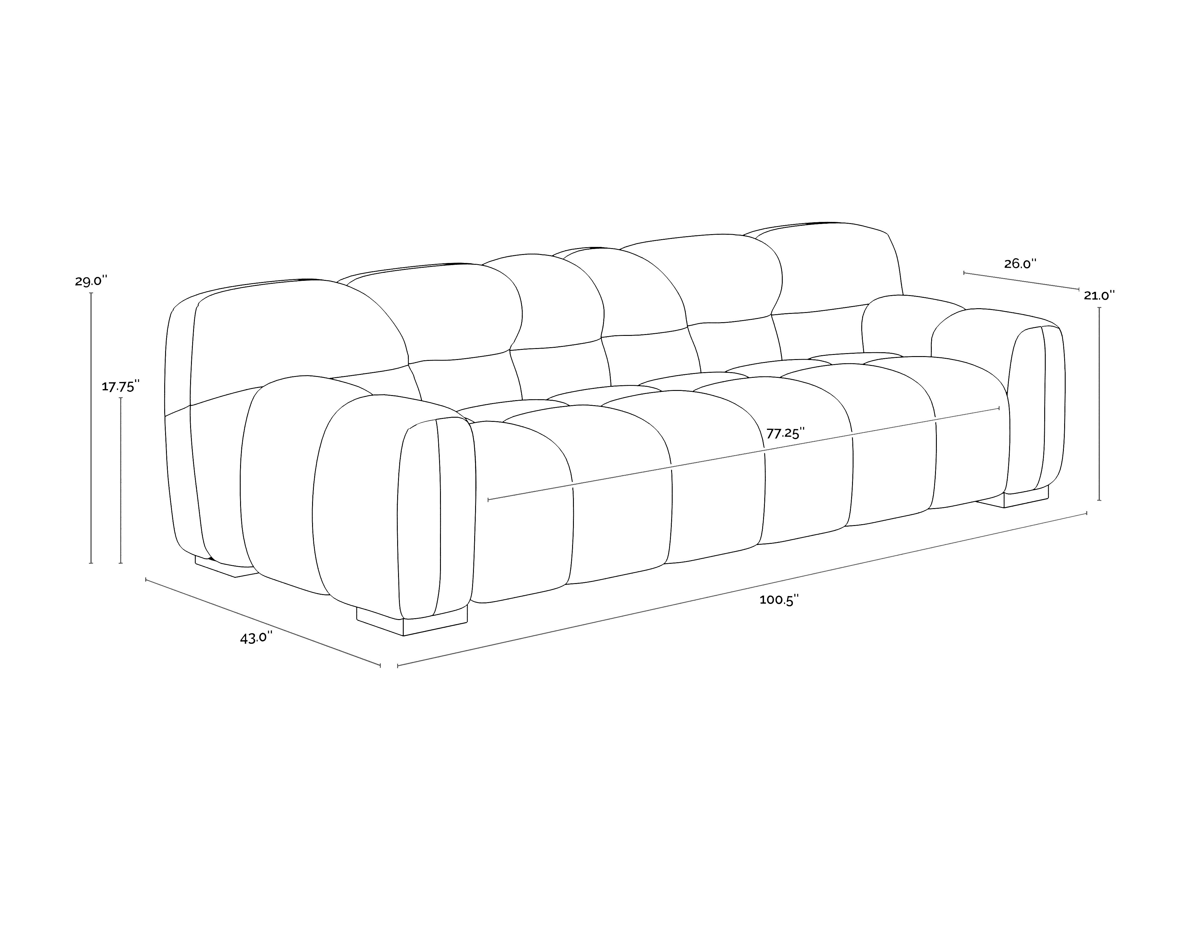 - Dimensions: Romy Sofa - Meg Gold 111336 = 100.5W x 43D x 29H | 142lbs