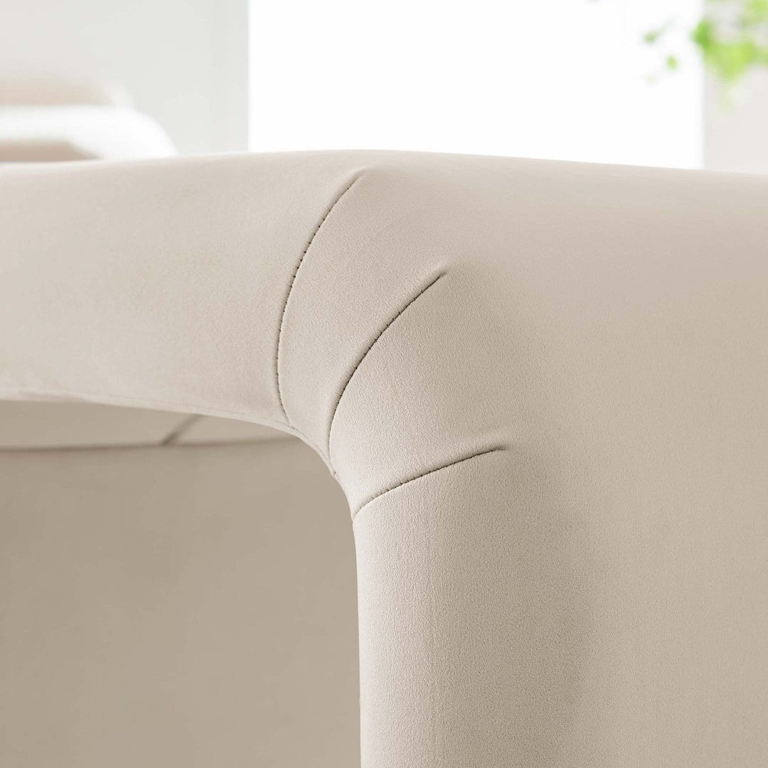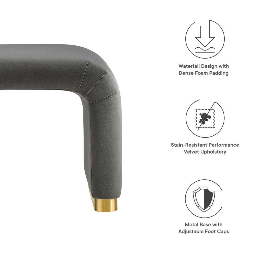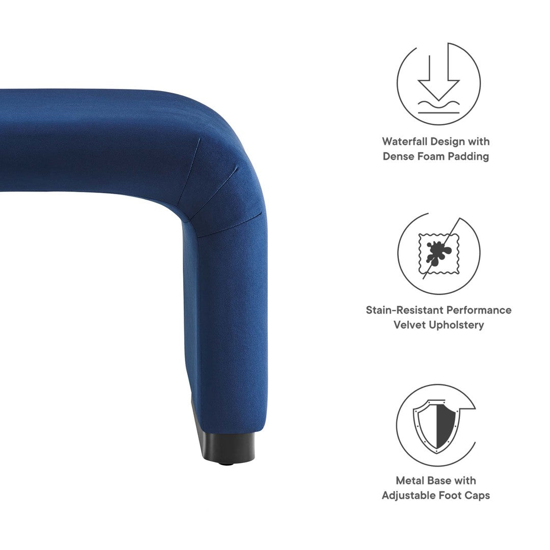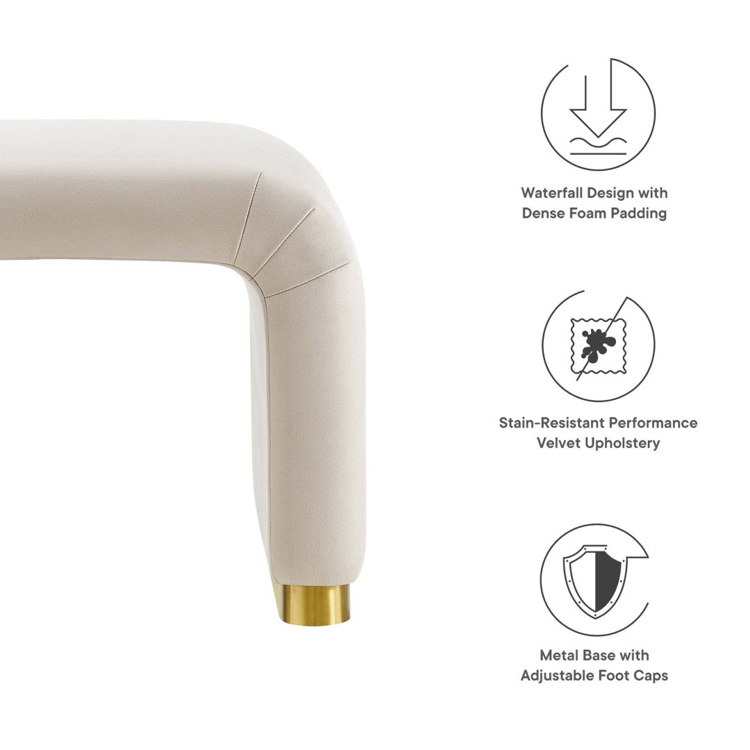 - Performance Velvet Upholstery Waterfall Design Stain-Resistant Fabric Dense Foam Padding Metal Base Adjustable Foot Caps Assembly Required