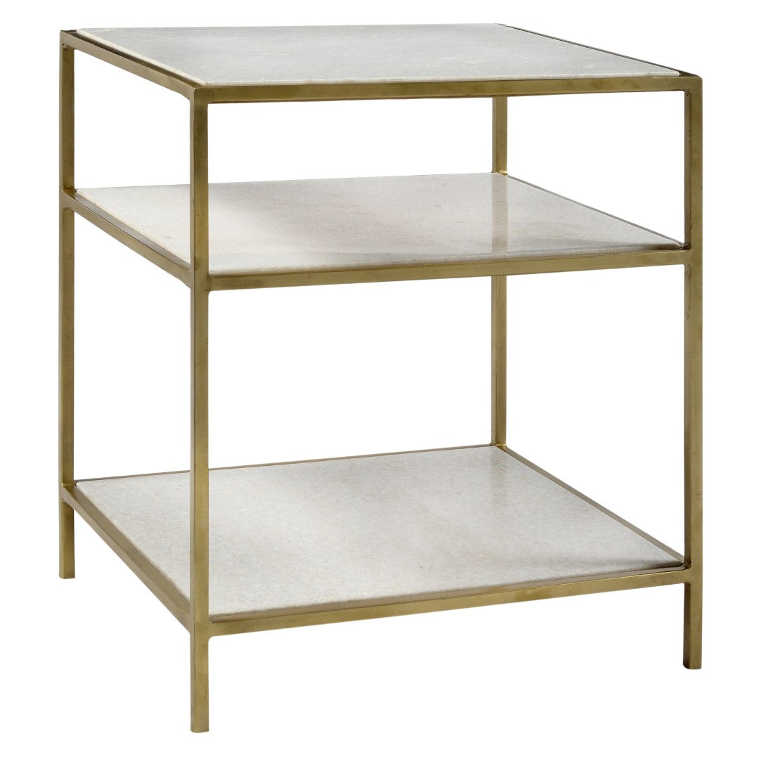 - Short Description: Modern Iron Framed Shelved Side table Finished in a Brushed Brass with White Banswara Marble Table Top Surfaces.